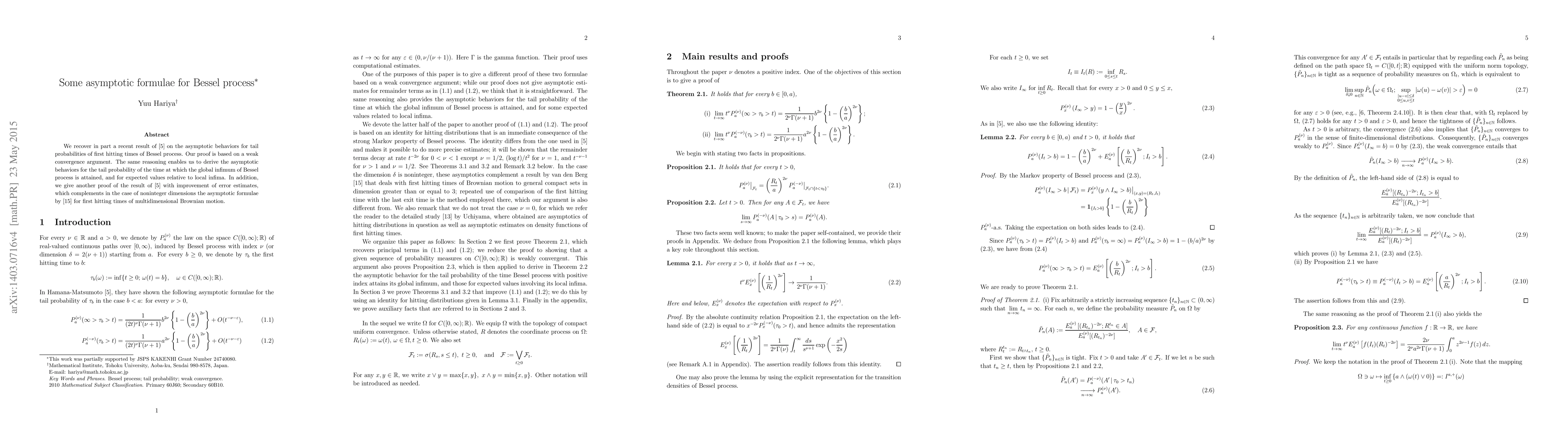 This paper recovers and improves upon previous results regarding the asymptotic behaviors of tail probabilities for first hitting times and global infimum attainment of Bessel processes. It employs a weak convergence argument, also providing a new proof with enhanced error estimates, complementing earlier work on multidimensional Brownian motion.