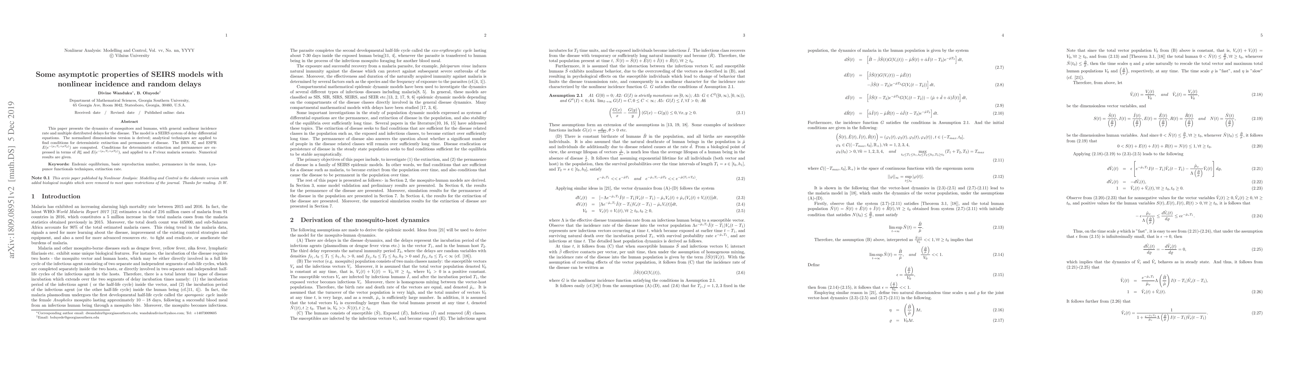 TThis paper presents the dynamics of mosquitoes and humans, with general nonlinear incidence rate and multiple distributed delays for the disease. The model is a SEIRS system of delay differential equations. The normalized dimensionless version is derived; analytical techniques are applied to find conditions for deterministic extinction and permanence of disease. The BRN $R^{*}_{0}$ and ESPR $E(e^{-(\mu_{v}T_{1}+\mu T_{2})})$ are computed. Conditions for deterministic extinction and permanence are expressed in terms of $R^{*}_{0}$ and $E(e^{-(\mu_{v}T_{1}+\mu T_{2})})$, and applied to a P.vivax malaria scenario. Numerical results are given.