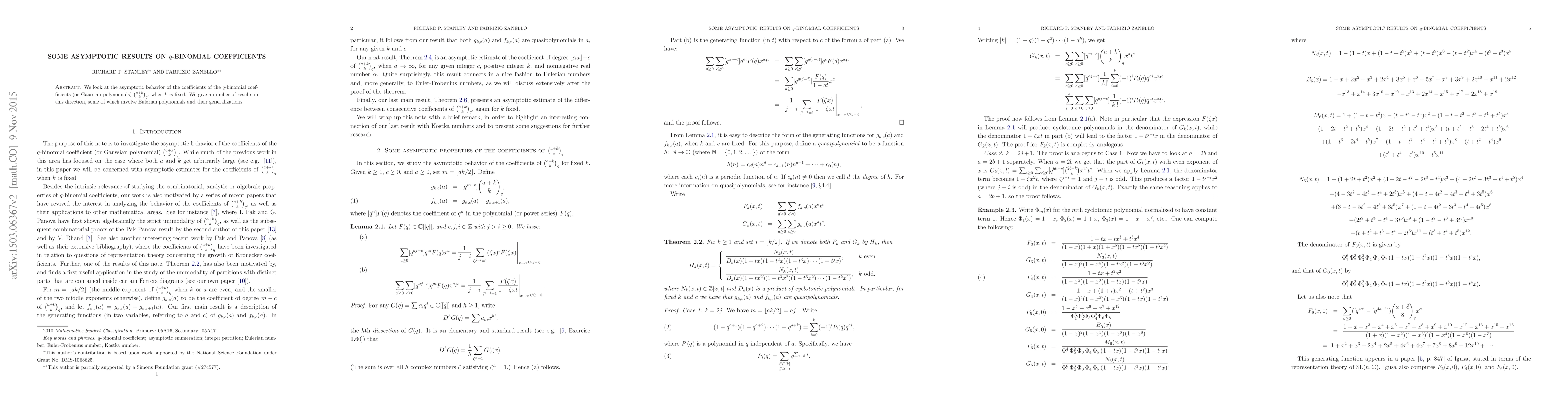 We look at the asymptotic behavior of the coefficients of the $q$-binomial coefficients (or Gaussian polynomials) $\binom{a+k}{k}_q$, when $k$ is fixed. We give a number of results in this direction, some of which involve Eulerian polynomials and their generalizations.