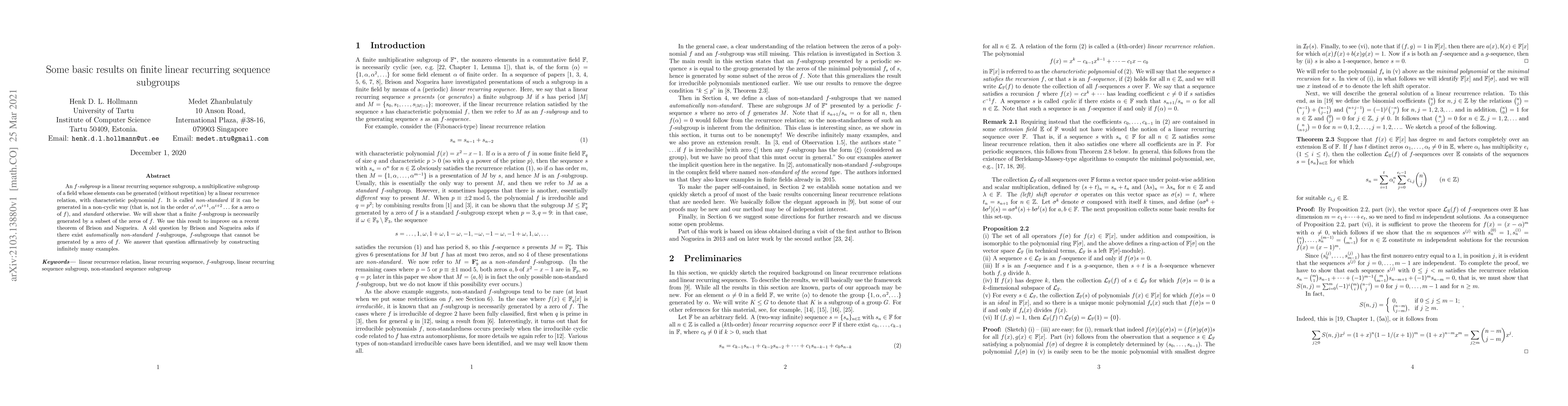 This paper investigates $f$-subgroups, linear recurring sequence subgroups of fields, proving that finite $f$-subgroups are generated by zeros of their characteristic polynomial. It also affirms the existence of infinitely many automatically non-standard $f$-subgroups, countering a question posed by Brison and Nogueira.