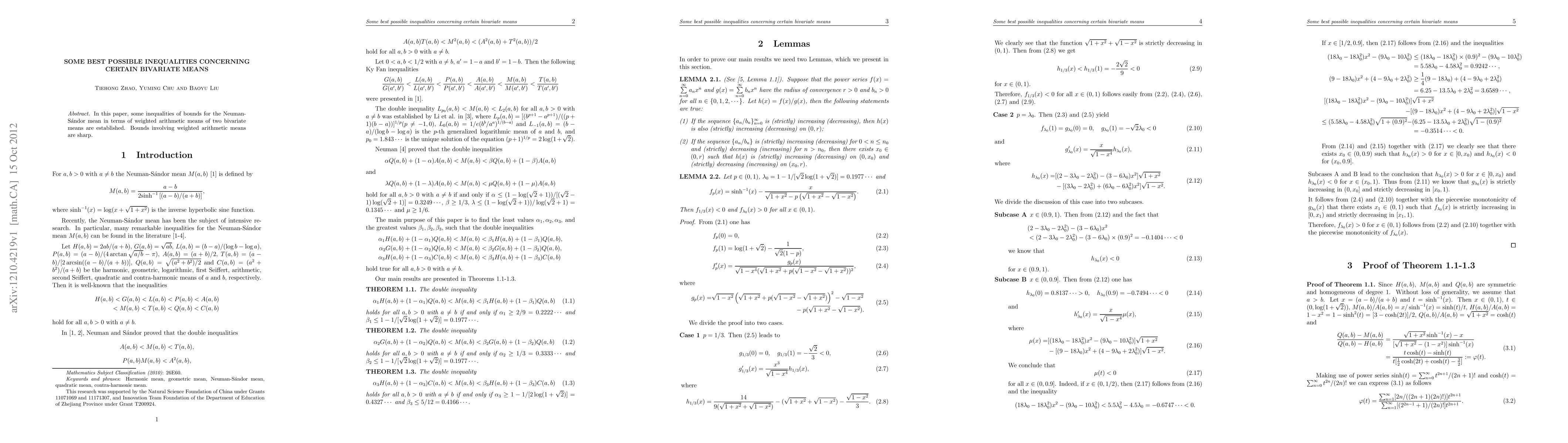 Summary: This paper establishes sharp inequalities relating the Neuman-Sándor mean to weighted arithmetic means of two bivariate means, providing precise bounds for these relationships.