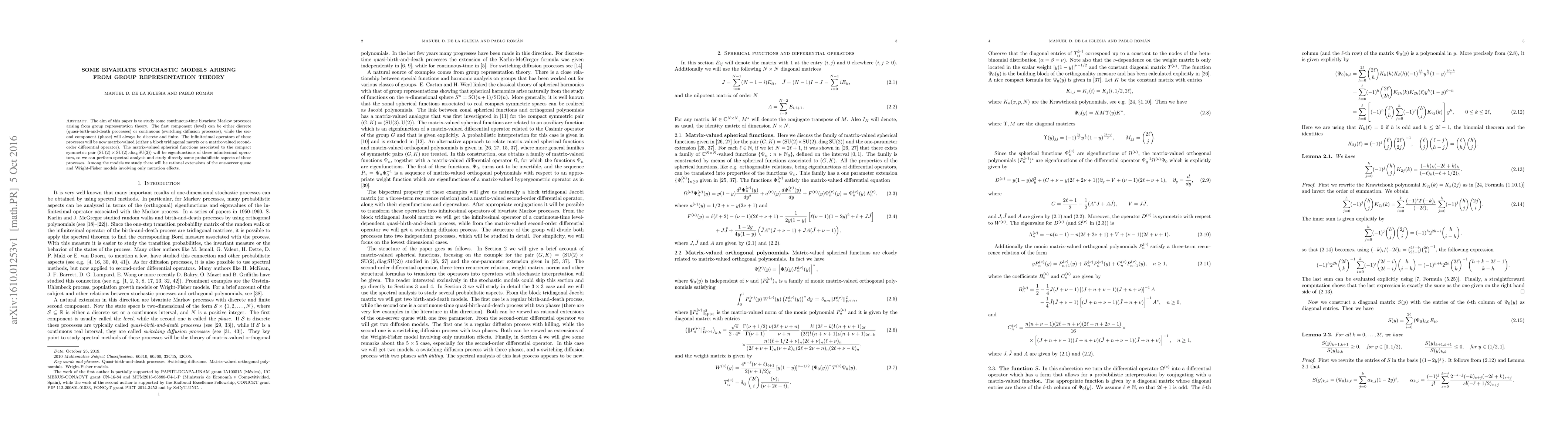 The aim of this paper is to study some continuous-time bivariate Markov processes arising from group representation theory. The first component (level) can be either discrete (quasi-birth-and-death processes) or continuous (switching diffusion processes), while the second component (phase) will always be discrete and finite. The infinitesimal operators of these processes will be now matrix-valued (either a block tridiagonal matrix or a matrix-valued second-order differential operator). The matrix-valued spherical functions associated to the compact symmetric pair $(\mathrm{SU}(2)\times \mathrm{SU}(2), \mathrm{diag} \, \mathrm{SU}(2))$ will be eigenfunctions of these infinitesimal operators, so we can perform spectral analysis and study directly some probabilistic aspects of these processes. Among the models we study there will be rational extensions of the one-server queue and Wright-Fisher models involving only mutation effects.