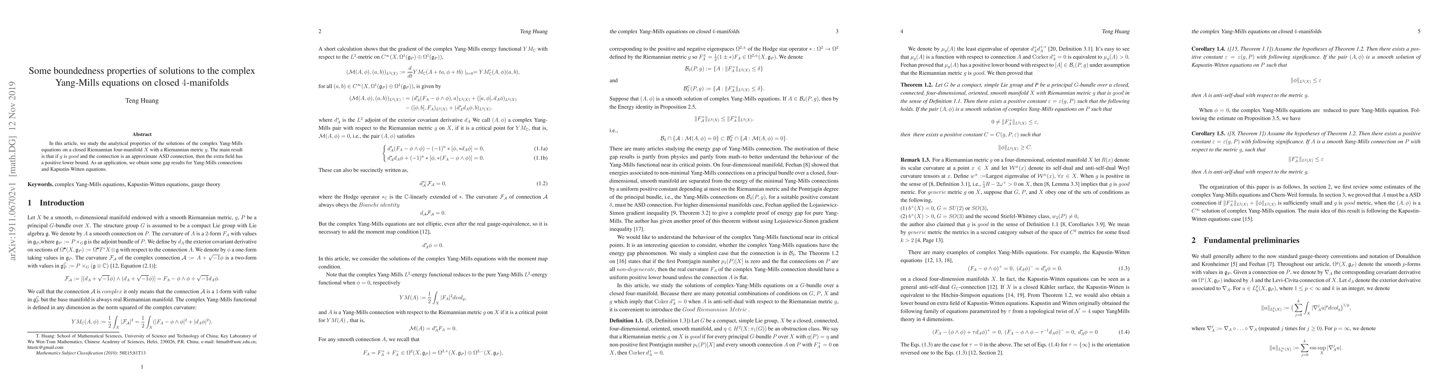 This paper investigates the analytical properties of solutions to the complex Yang-Mills equations on closed four-manifolds, showing that under certain conditions, the extra field has a positive lower bound. The findings also yield gap results for Yang-Mills connections and Kapustin-Witten equations.