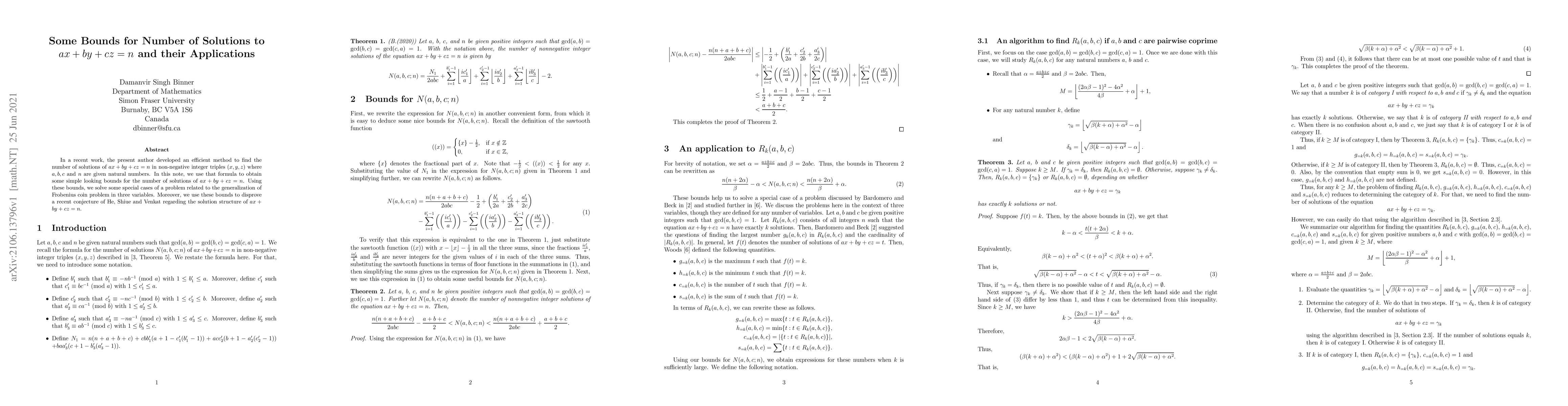 This paper establishes bounds for the number of non-negative integer solutions to the equation $ax+by+cz=n$ and applies these bounds to resolve specific instances of the three-variable generalization of the Frobenius coin problem, while also refuting a recent conjecture about the solution structure of such equations.