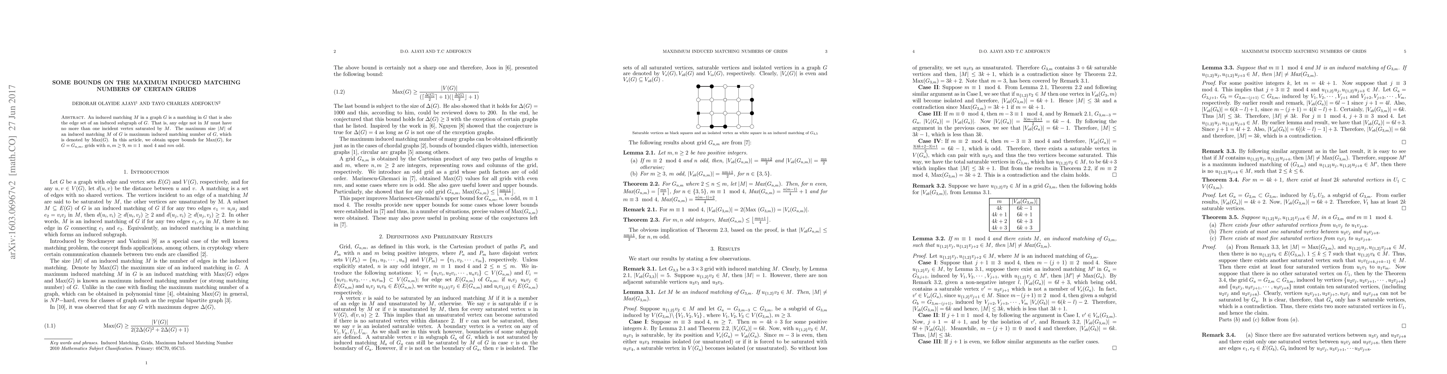 An induced matching $M$ in a graph $G$ is a matching in $G$ that is also the edge set of an induced subgraph of $G$. That is, any edge not in $M$ must have no more than one incident vertex saturated by $M$. The maximum size $|M|$ of an induced matching $M$ of $G$ is maximum induced matching number of $G$, which is denoted by $\textrm{Max}(G)$. In this article, we obtain upper bounds for $\textrm{Max}(G)$, for $G=G_{n,m}$, grids with $n,m \geq 9$, $m\equiv 1 \mod 4$ and $nm$ odd.