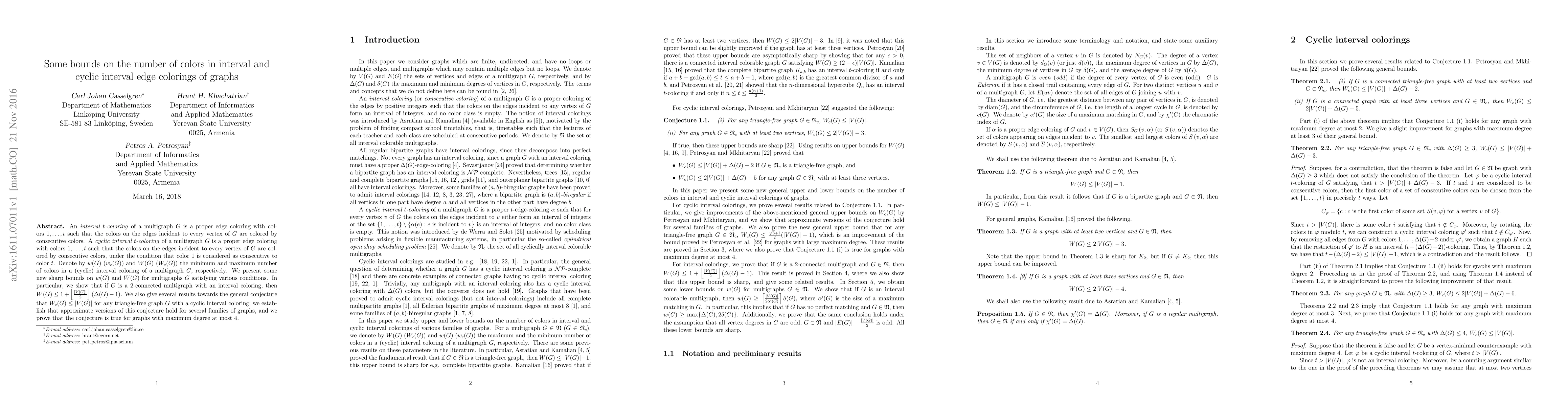 This paper presents new bounds on the minimum and maximum number of colors in interval and cyclic interval edge colorings of multigraphs. It establishes that for $2$-connected multigraphs with interval colorings, the maximum number of colors is bounded by $1+\left\lfloor \frac{|V(G)|}{2}\right\rfloor(\Delta(G)-1)$. Additionally, it supports the conjecture that $W_{c}(G)\leq |V(G)|$ for triangle-free graphs with cyclic interval colorings, proving it for graphs with a maximum degree of $4$.