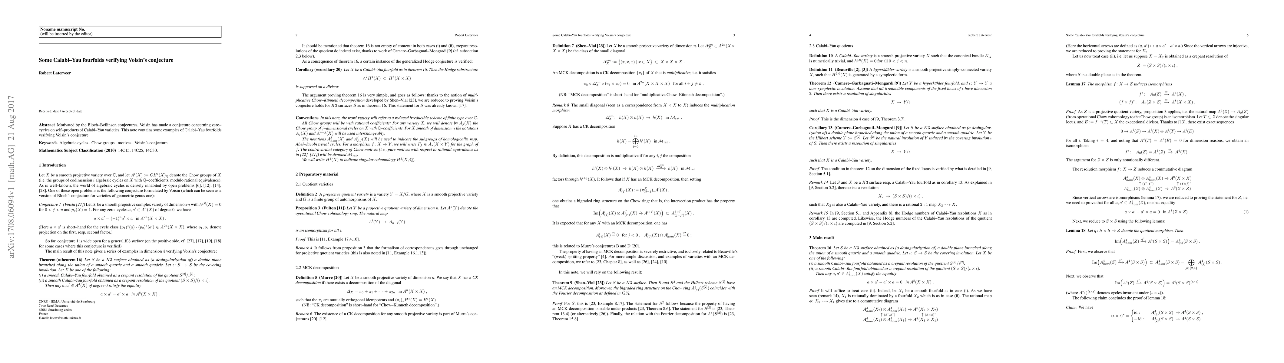 This paper provides examples of Calabi-Yau fourfolds that confirm Voisin's conjecture on the behavior of zero-cycles on self-products of Calabi-Yau varieties, motivated by the Bloch-Beilinson conjectures.