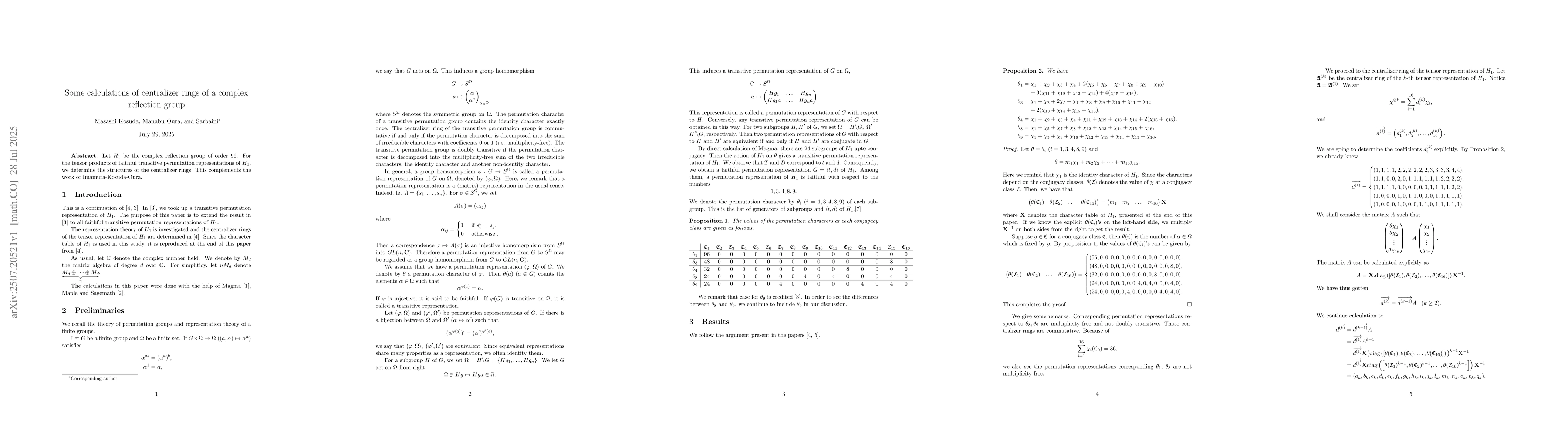 Let H1 be the complex reflection group of order 96. For the tensor products of faithful transitive permutation representations of H1, we determine the structures of the centralizer rings. This complements the work of Imamura-Kosuda-Oura.