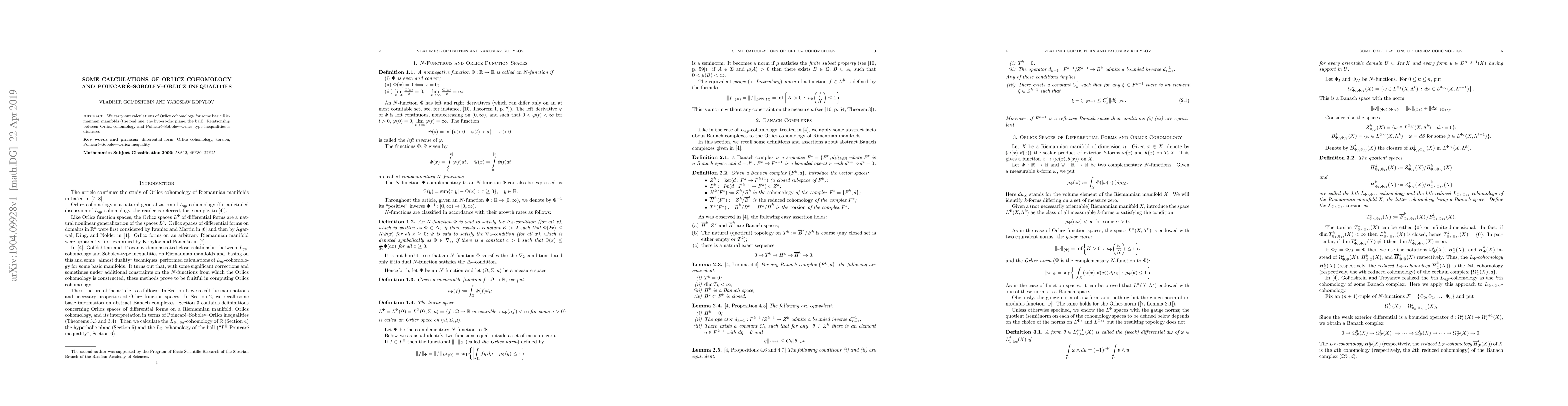 This paper calculates Orlicz cohomology for fundamental Riemannian manifolds like the real line, hyperbolic plane, and ball, and explores the connection between Orlicz cohomology and Poincar\'e--Sobolev--Orlicz inequalities.