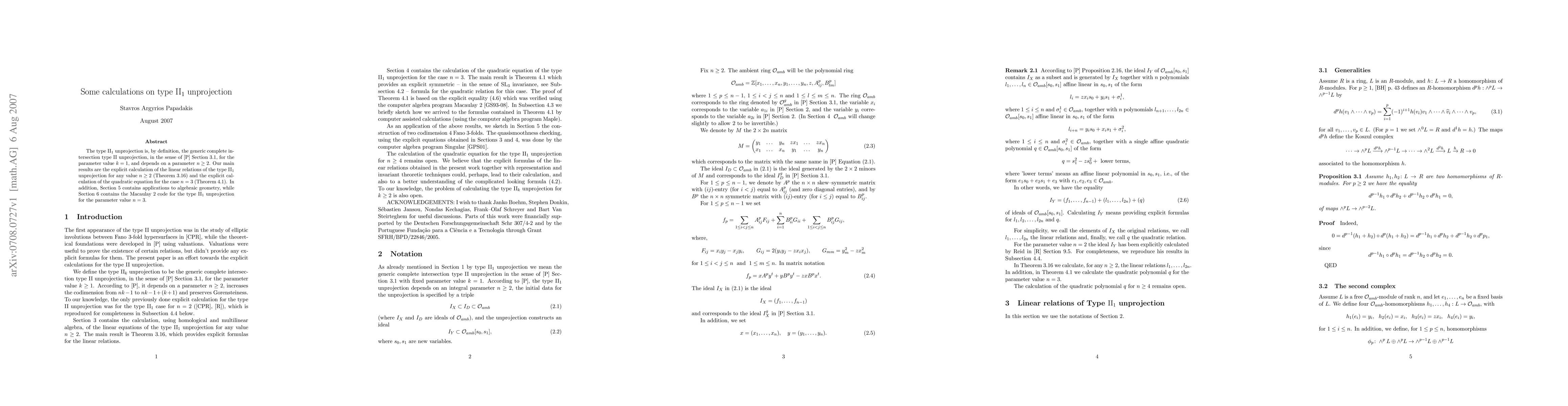 The type II_1 unprojection is, by definition, the generic complete intersection type II unprojection, in the sense of [Papadakis, Type II unprojection, J. Algebraic Geometry, 15 (2006) 399--414] Section 3.1, for the parameter value k = 1, and depends on a parameter n greater or equal than 2. Our main results are the explicit calculation of the linear relations of the type II_1 unprojection for any value of n greater or equal than 2 (Theorem 3.16) and the explicit calculation of the quadratic equation for the case n = 3 (Theorem 4.1). In addition, Section 5 contains applications to algebraic geometry while Section 6 contains the Macaulay 2 code for the type II_1 unprojection for the parameter value n = 3.
