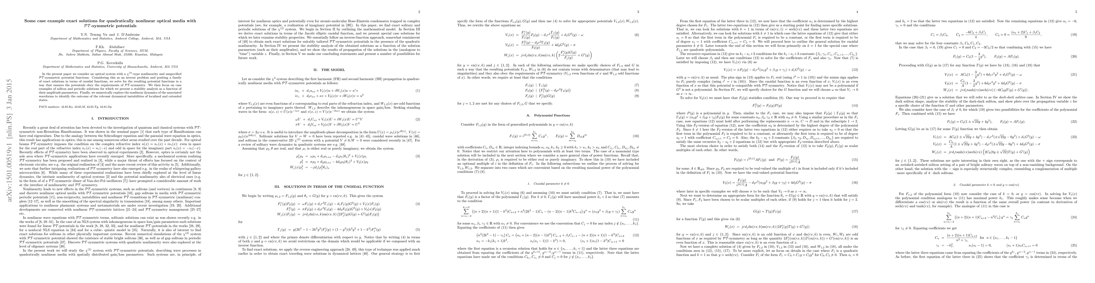 In the present paper we consider an optical system with a $\chi^{(2)}$-type nonlinearity and unspecified $\mathcal{PT}$-symmetric potential functions. Considering this as an inverse problem and positing a family of exact solutions in terms of cnoidal functions, we solve for the resulting potential functions in a way that ensures the potentials obey the requirements of $\mathcal{PT}$-symmetry. We then focus on case examples of soliton and periodic solutions for which we present a stability analysis as a function of their amplitude parameters. Finally, we numerically explore the nonlinear dynamics of the associated waveforms to identify the outcome of the relevant dynamical instabilities of localized and extended states.