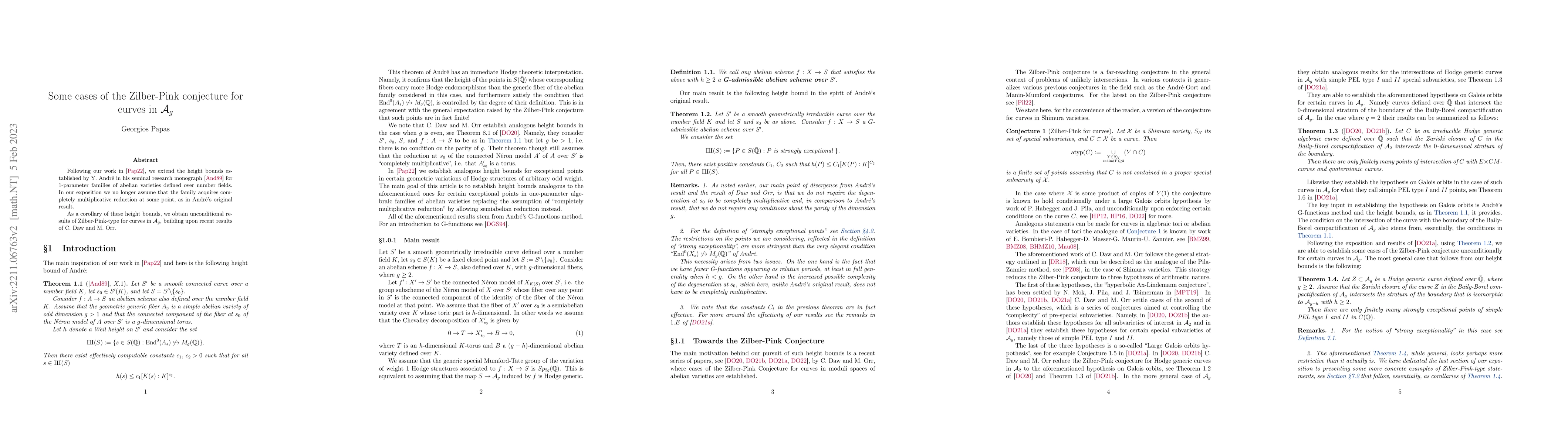 Following our work in \cite{papas2022height}, we extend the height bounds established by Y. Andr\'e in his seminal research monograph \cite{andre1989g} for $1$-parameter families of abelian varieties defined over number fields. In our exposition we no longer assume that the family acquires completely multiplicative reduction at some point, as in Andr\'e's original result. As a corollary of these height bounds, we obtain unconditional results of Zilber-Pink-type for curves in $\mathcal{A}_g$, building upon recent results of C. Daw and M. Orr.