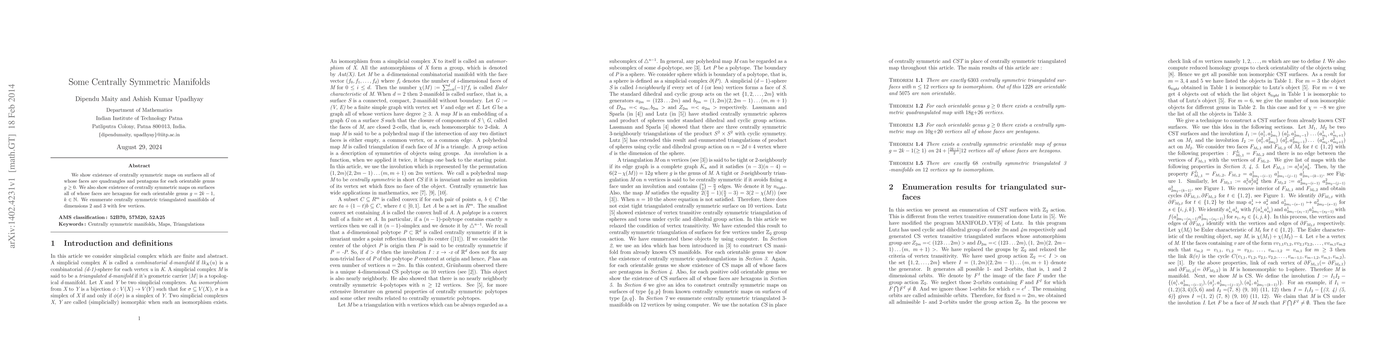 This paper demonstrates the existence of centrally symmetric maps on surfaces where faces are either quadrangles, pentagons, or hexagons, for various orientable genera. It also enumerates such symmetric triangulated manifolds in dimensions 2 and 3 with minimal vertices.