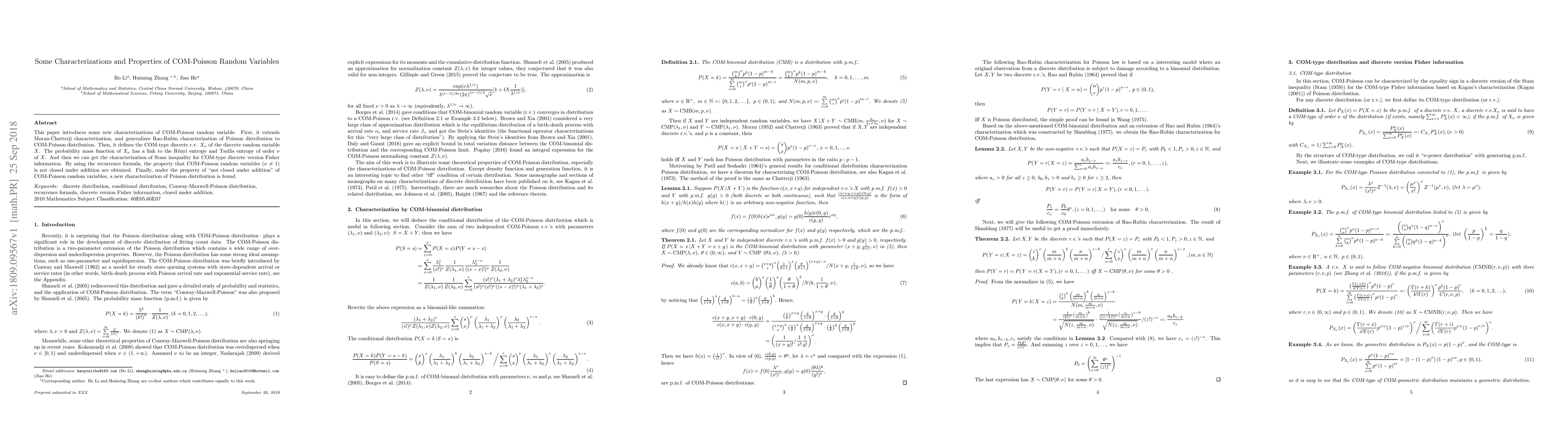 This paper introduces new characterizations of COM-Poisson random variables, extending existing characterizations of the Poisson distribution and defining a COM-type discrete random variable linked to Rényi and Tsallis entropy. It also reveals that COM-Poisson variables are not closed under addition, leading to a new characterization of the Poisson distribution.