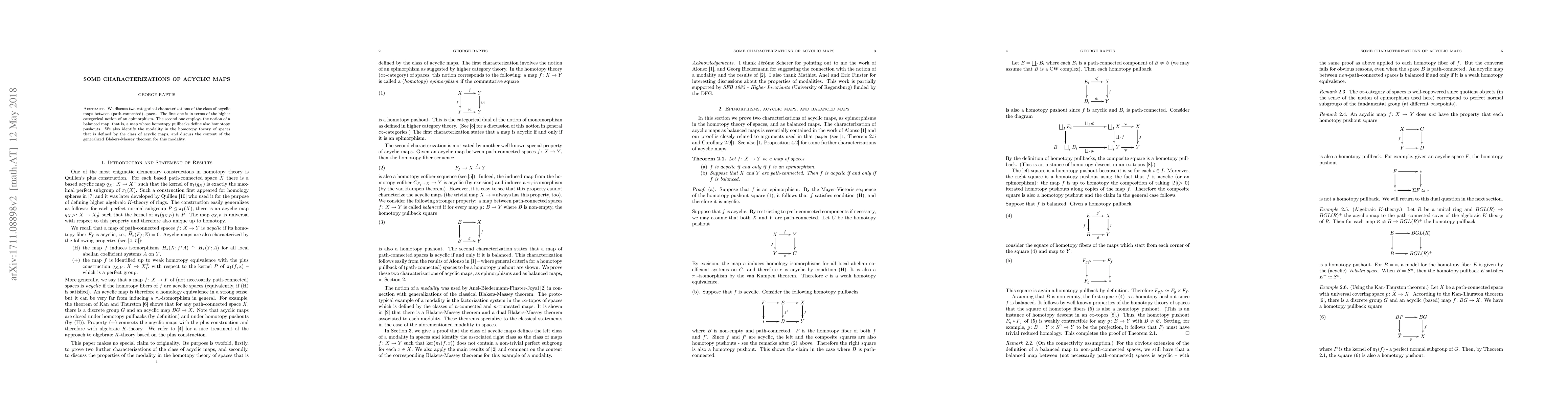 We discuss two categorical characterizations of the class of acyclic maps between (path-connected) spaces. The first one is in terms of the higher categorical notion of an epimorphism. The second one employs the notion of a balanced map, that is, a map whose homotopy pullbacks define also homotopy pushouts. We also identify the modality in the homotopy theory of spaces that is defined by the class of acyclic maps, and discuss the content of the generalized Blakers-Massey theorem for this modality.