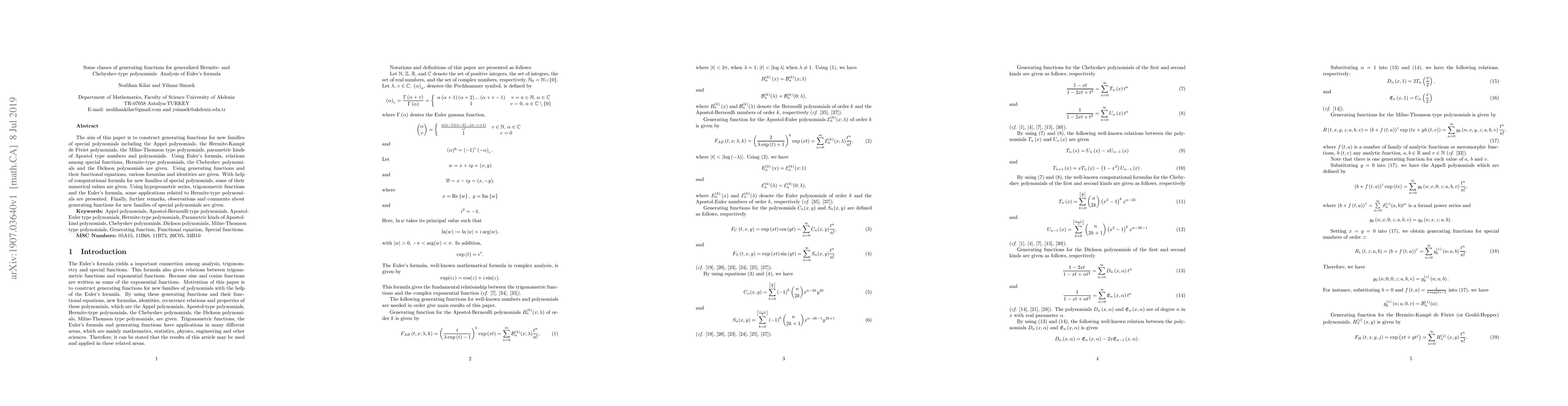 This paper constructs generating functions for various special polynomials, including Appel and Hermite-Kampè de Fériet polynomials, and uses Euler's formula to derive relations among these polynomials and others like Chebyshev and Dickson polynomials, presenting applications and computational insights.