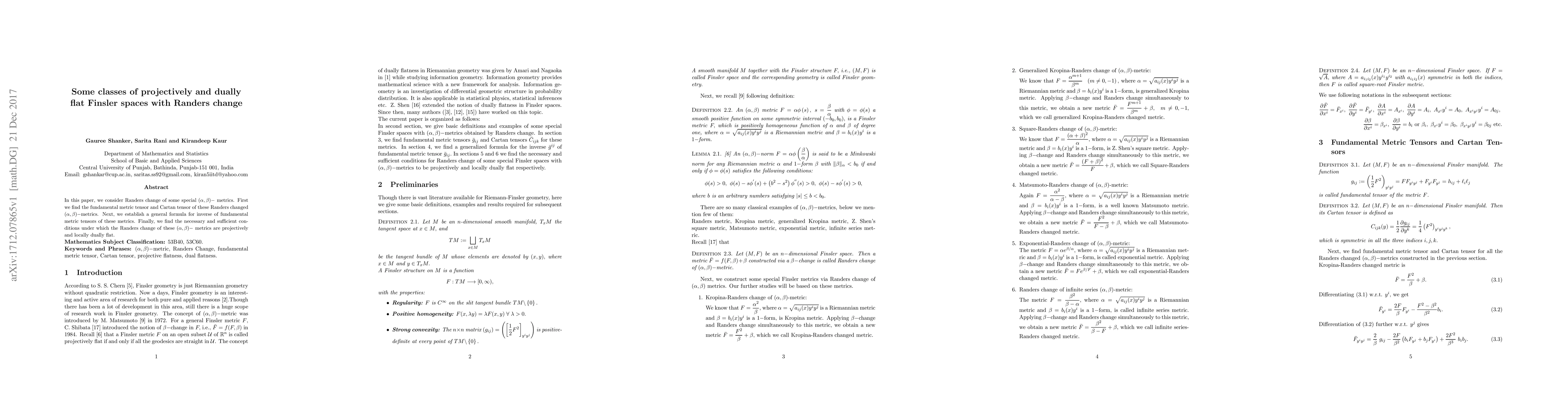This paper explores Randers changes in specific $(\alpha, \beta)$-metrics, deriving their fundamental metric tensors and Cartan tensors. It also provides a general formula for the inverse of these tensors and determines the conditions for projectively and locally dually flat Randers changes.