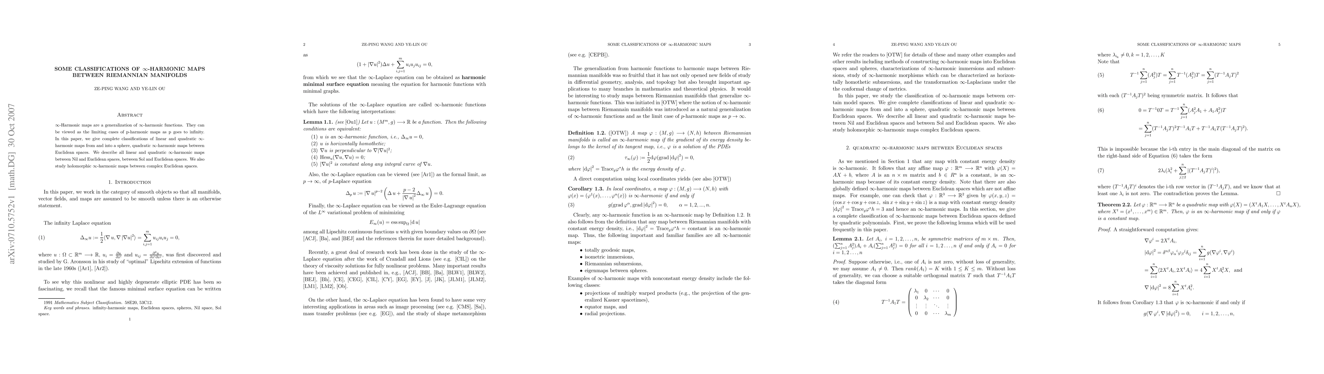 This paper classifies linear and quadratic $\infty$-harmonic maps, particularly focusing on those from and into spheres, between Euclidean spaces, and from Nil and Sol spaces to Euclidean spaces. It also examines holomorphic $\infty$-harmonic maps between complex Euclidean spaces.
