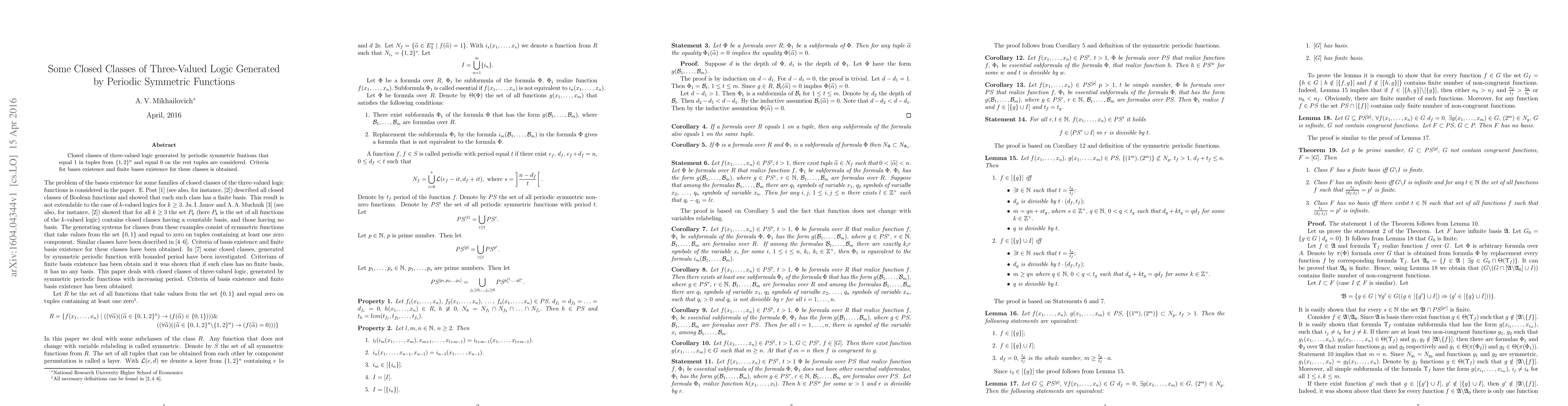 Closed classes of three-valued logic generated by periodic symmetric funtions that equal $1$ in tuples from $\{1,2\}^n$ and equal $0$ on the rest tuples are considered. Criteria for bases existence and finite bases existence for these classes is obtained.
