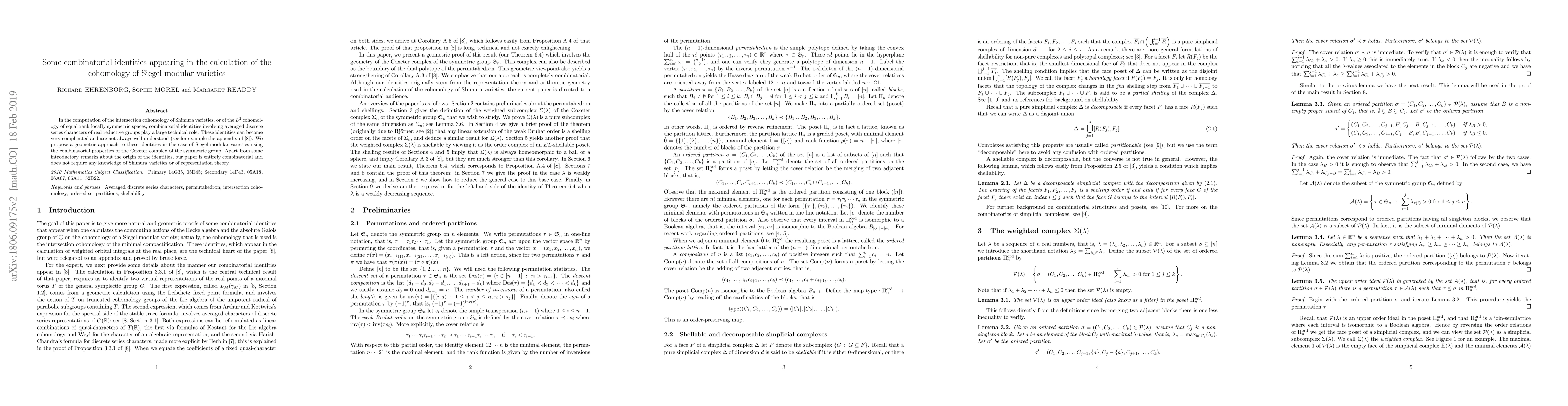 This paper proposes a geometric approach to complex combinatorial identities arising in the cohomology of Siegel modular varieties, leveraging the combinatorial properties of the Coxeter complex of the symmetric group, without requiring background knowledge in Shimura varieties or representation theory. The focus is purely on combinatorial techniques to understand these identities.