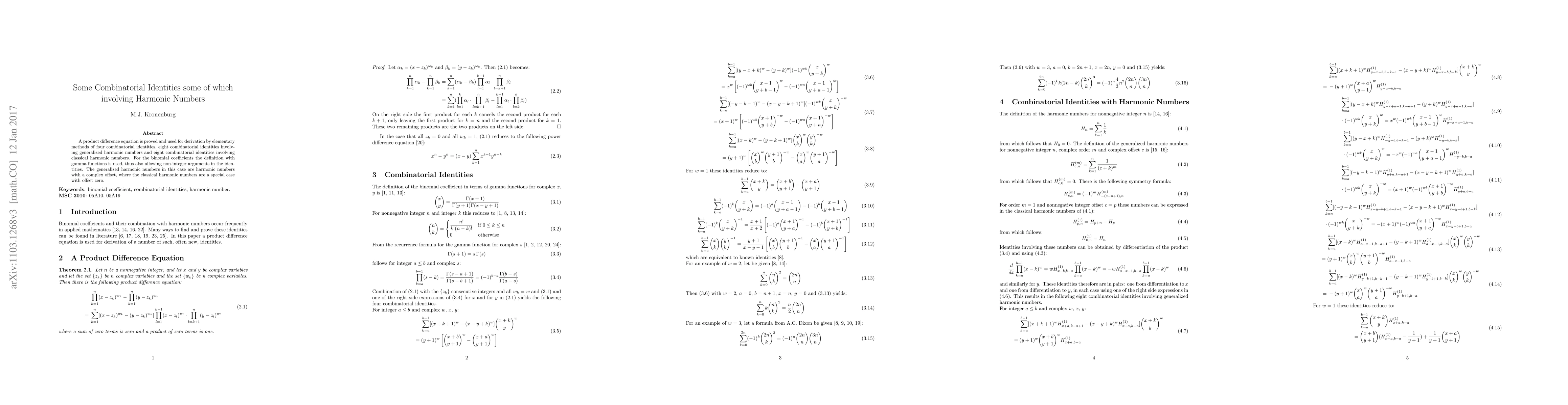 This paper proves a product difference equation to derive various combinatorial identities, including four basic ones, eight involving generalized harmonic numbers, and eight involving classical harmonic numbers, using binomial coefficients defined with gamma functions for non-integer arguments.