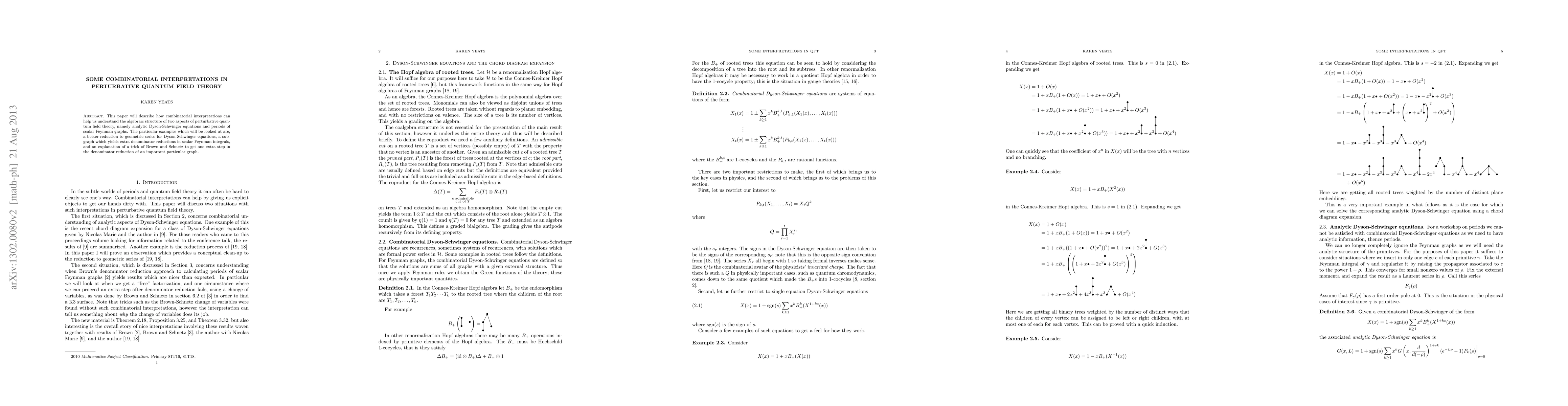 This paper explores how combinatorial interpretations enhance the understanding of the algebraic structure in perturbative quantum field theory, specifically in relation to Dyson-Schwinger equations and scalar Feynman graph periods, through examples of simplified reductions and novel tricks in denominator analysis.