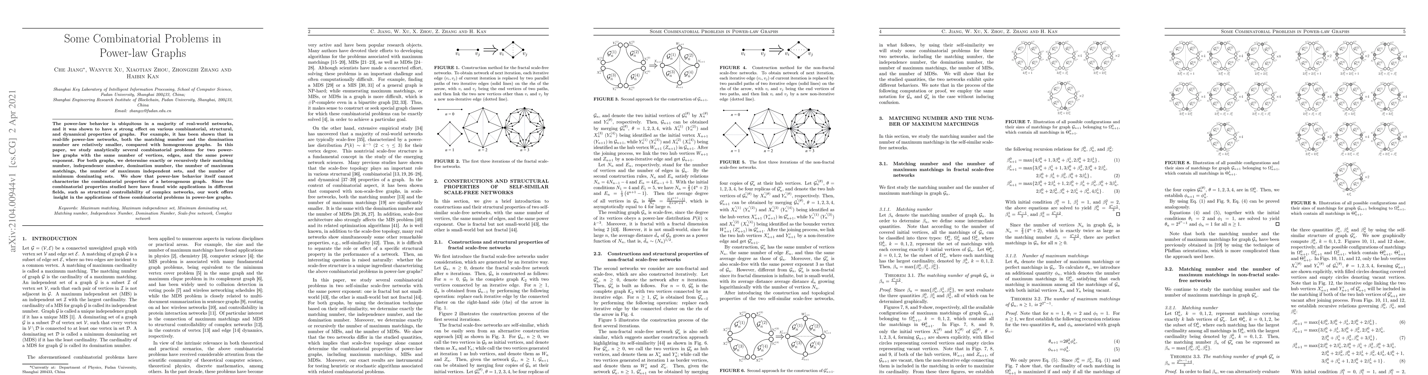 The power-law behavior is ubiquitous in a majority of real-world networks, and it was shown to have a strong effect on various combinatorial, structural, and dynamical properties of graphs. For example, it has been shown that in real-life power-law networks, both the matching number and the domination number are relatively smaller, compared with homogeneous graphs. In this paper, we study analytically several combinatorial problems for two power-law graphs with the same number of vertices, edges, and the same power exponent. For both graphs, we determine exactly or recursively their matching number, independence number, domination number, the number of maximum matchings, the number of maximum independent sets, and the number of minimum dominating sets. We show that power-law behavior itself cannot characterize the combinatorial properties of a heterogenous graph. Since the combinatorial properties studied here have found wide applications in different fields, such as structural controllability of complex networks, our work offers insight in the applications of these combinatorial problems in power-law graphs.