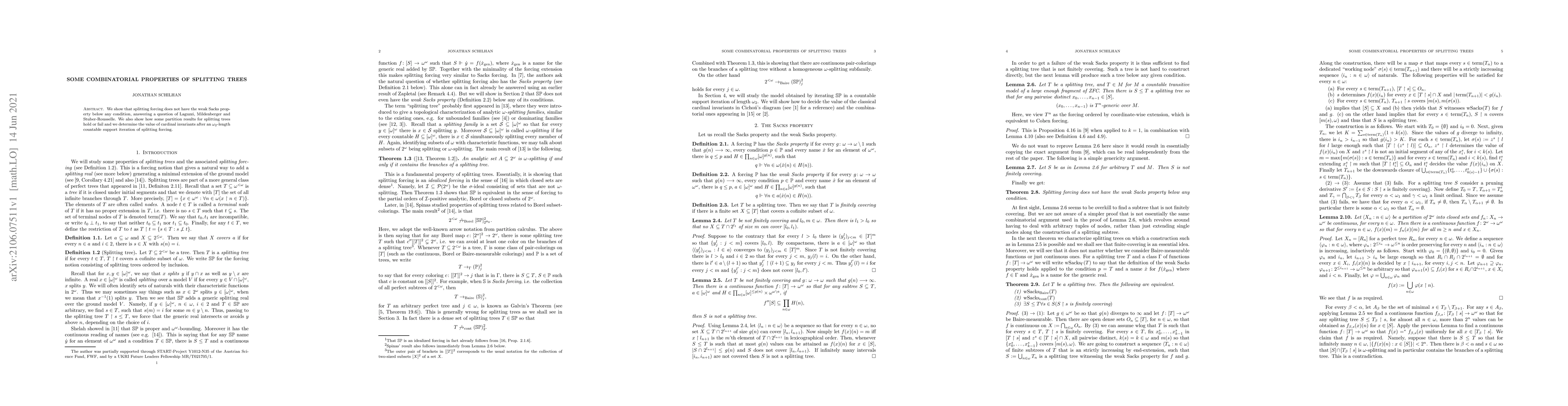 This paper demonstrates that splitting forcing lacks the weak Sacks property below any condition, addressing a query posed by Laguzzi, Mildenberger, and Stuber-Rousselle. Additionally, it explores partition results for splitting trees and evaluates the impact of an $\omega_2$-length countable support iteration of splitting forcing on cardinal invariants.