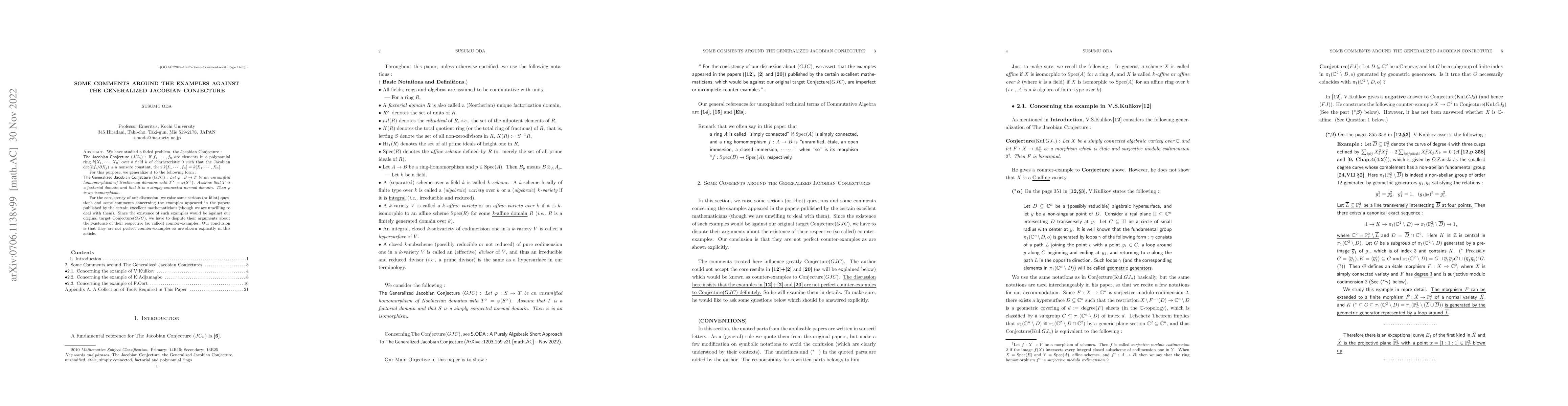 We have studied a faded problem, the Jacobian Conjecture ~: \noindent {\sf The Jacobian Conjecture $(JC_n)$}~: If $f_1, \cdots, f_n$ are elements in a polynomial ring $k[X_1, \cdots, X_n]$ over a field $k$ of characteristic $0$ such that the Jacobian $\det(\partial f_i/ \partial X_j) $ is a nonzero constant, then $k[f_1, \cdots, f_n] = k[X_1, \cdots, X_n]$. For this purpose, we generalize it to the following form~: \noindent {\sf The Generalized Jacobian Conjecture $(GJC)$}~: {\it Let $\varphi : S \rightarrow T$ be an unramified homomorphism of Noetherian domains with $T^\times = \varphi(S^\times)$. Assume that $T$ is a factorial domain and that $S$ is a simply connected normal domain. Then $\varphi$ is an isomorphism. } For the consistency of our discussion, we raise some serious (or idiot) questions and some comments concerning the examples appeared in the papers published by the certain excellent mathematicians (though we are unwilling to deal with them). Since the existence of such examples would be against our original target Conjecture$(GJC)$, we have to dispute their arguments about the existence of their respective (so called) counter-examples. Our conclusion is that they are not perfect counter-examples as are shown explicitly.