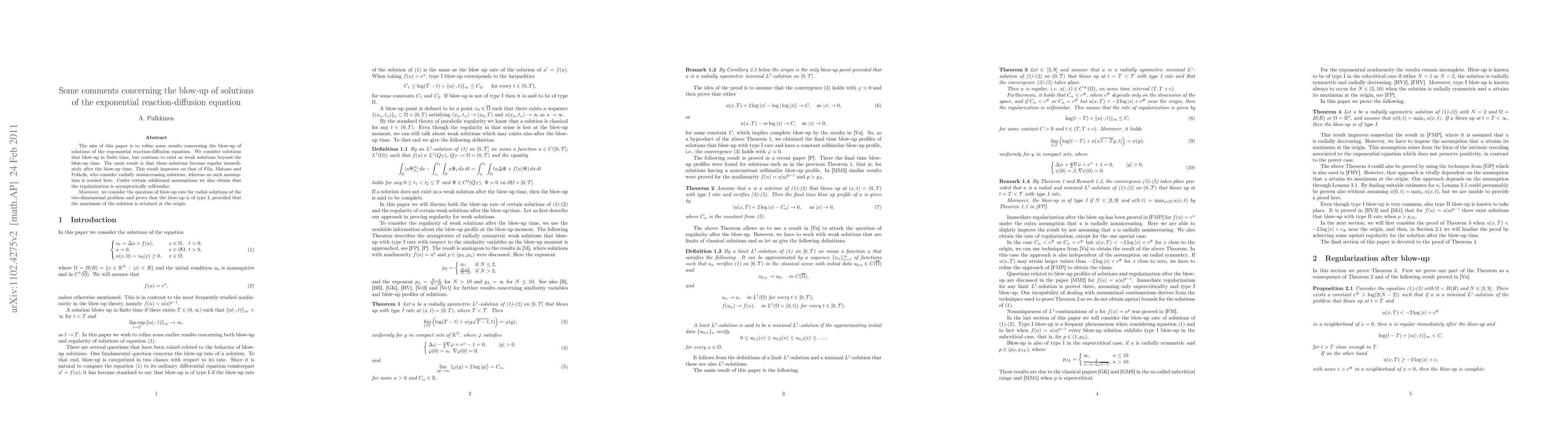 This paper refines results on the blow-up of solutions to the exponential reaction-diffusion equation, showing that these solutions become regular immediately after blow-up without the need for radial symmetry. Additionally, it proves that the blow-up is of type I for radial solutions in two dimensions when the maximum is at the origin.
