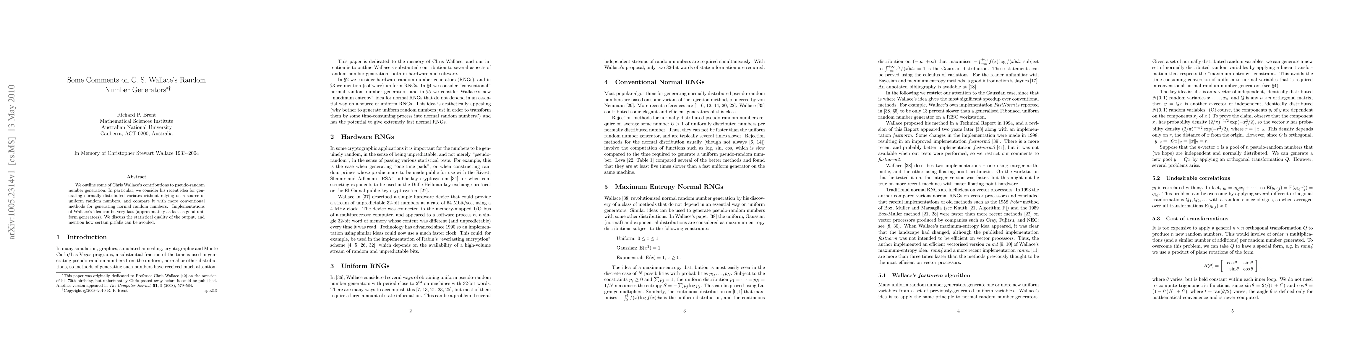 Summary: This paper reviews Chris Wallace's innovative method for generating normally distributed random numbers without uniform random sources, comparing it to conventional techniques. It highlights the speed and statistical quality of Wallace's approach while noting potential pitfalls and their avoidance.