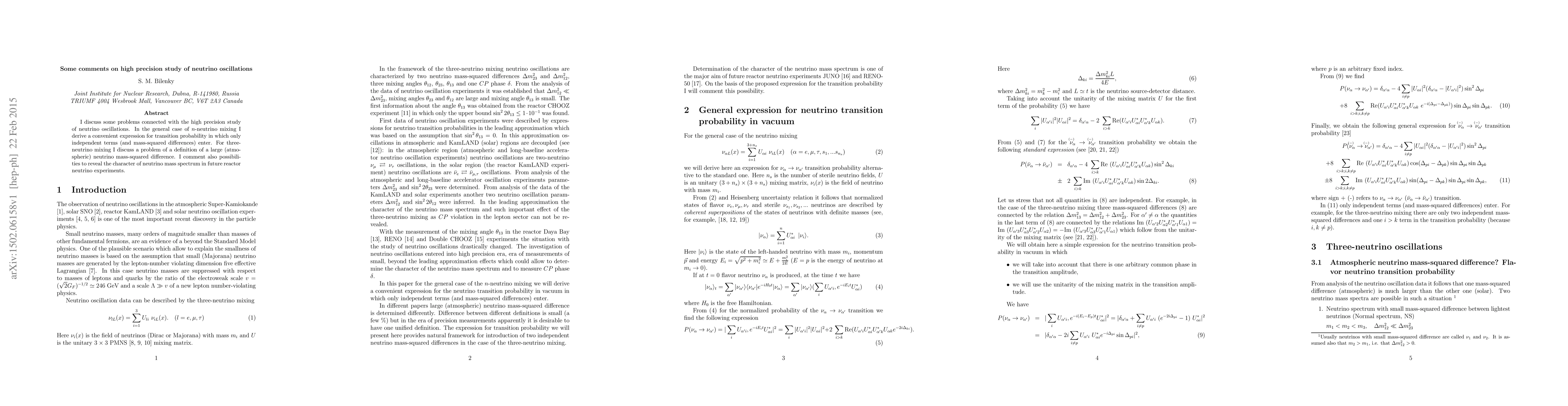 I discuss some problems connected with the high precision study of neutrino oscillations. In the general case of $n$-neutrino mixing I derive a convenient expression for transition probability in which only independent terms (and mass-squared differences) enter. For three-neutrino mixing I discuss a problem of a definition of a large (atmospheric) neutrino mass-squared difference. I comment also possibilities to reveal the character of neutrino mass spectrum in future reactor neutrino experiments.