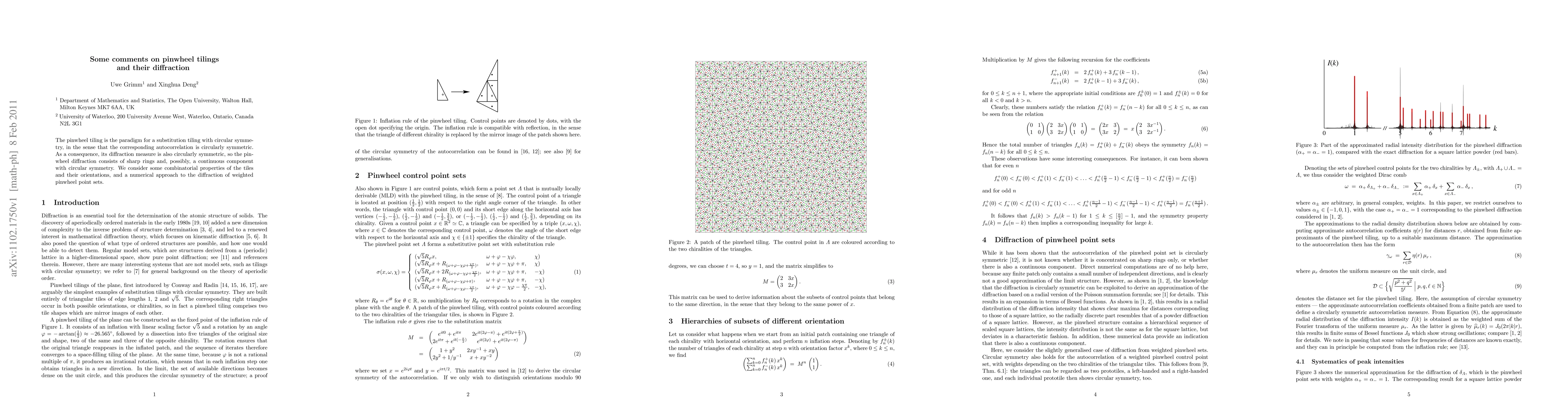 This paper explores the pinwheel tiling, a substitution tiling with circular symmetry, and its diffraction properties, revealing sharp rings and possibly a continuous component in its diffraction measure. It also examines combinatorial properties and uses numerical methods to analyze the diffraction of weighted pinwheel point sets.