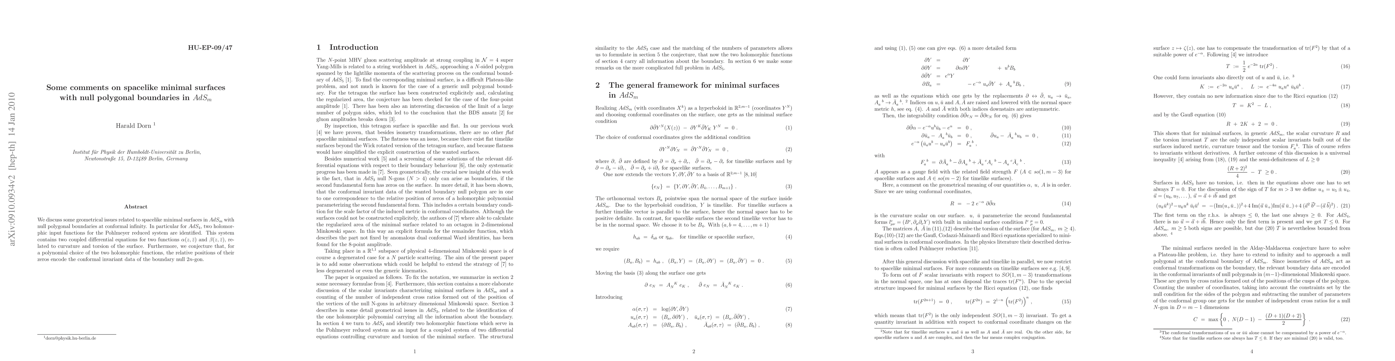 We discuss some geometrical issues related to spacelike minimal surfaces in $AdS_m$ with null polygonal boundaries at conformal infinity. In particular for $AdS_4$, two holomorphic input functions for the Pohlmeyer reduced system are identified. This system contains two coupled differential equations for two functions $\alpha (z,\bar z)$ and $\beta (z,\bar z)$, related to curvature and torsion of the surface. Furthermore, we conjecture that, for a polynomial choice of the two holomorphic functions, the relative positions of their zeros encode the conformal invariant data of the boundary null $2n$-gon.