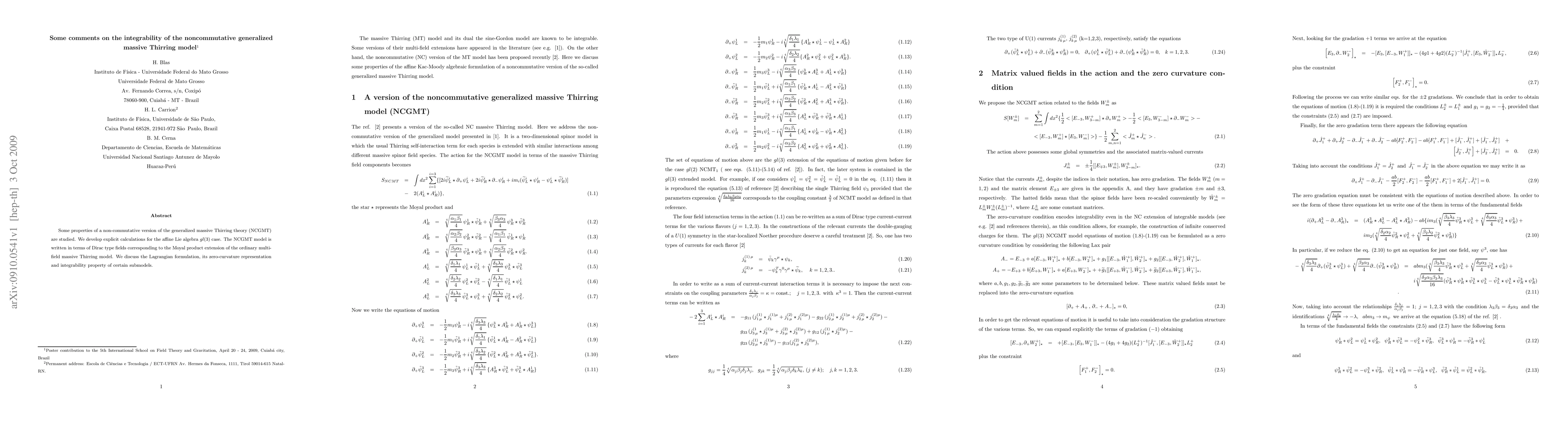 Some properties of a non-commutative version of the generalized massive Thirring theory (NCGMT) are studied. We develop explicit calculations for the affine Lie algebra $gl(3)$ case. The NCGMT model is written in terms of Dirac type fields corresponding to the Moyal product extension of the ordinary multi-field massive Thirring model. We discuss the Lagrangian formulation, its zero-curvature representation and integrability property of certain submodels.