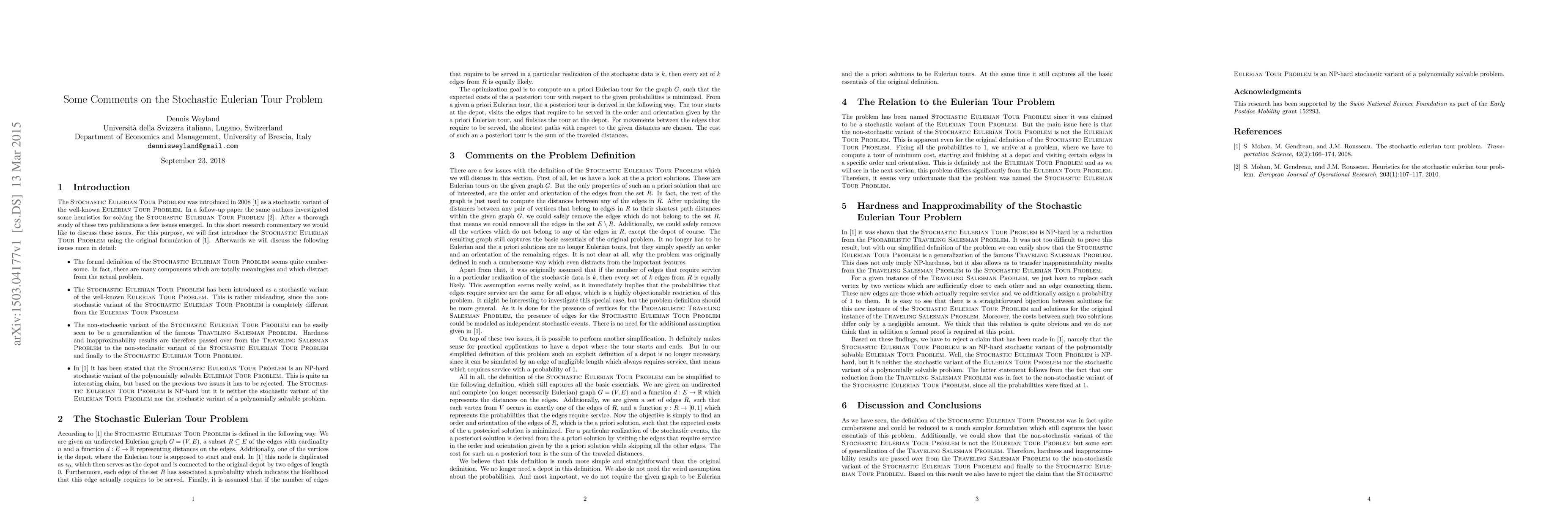 Title: Some Comments on the Stochastic Eulerian Tour Problem Summary: This paper critiques previous studies on heuristics for solving the Stochastic Eulerian Tour Problem, highlighting several issues and suggesting areas for further research.