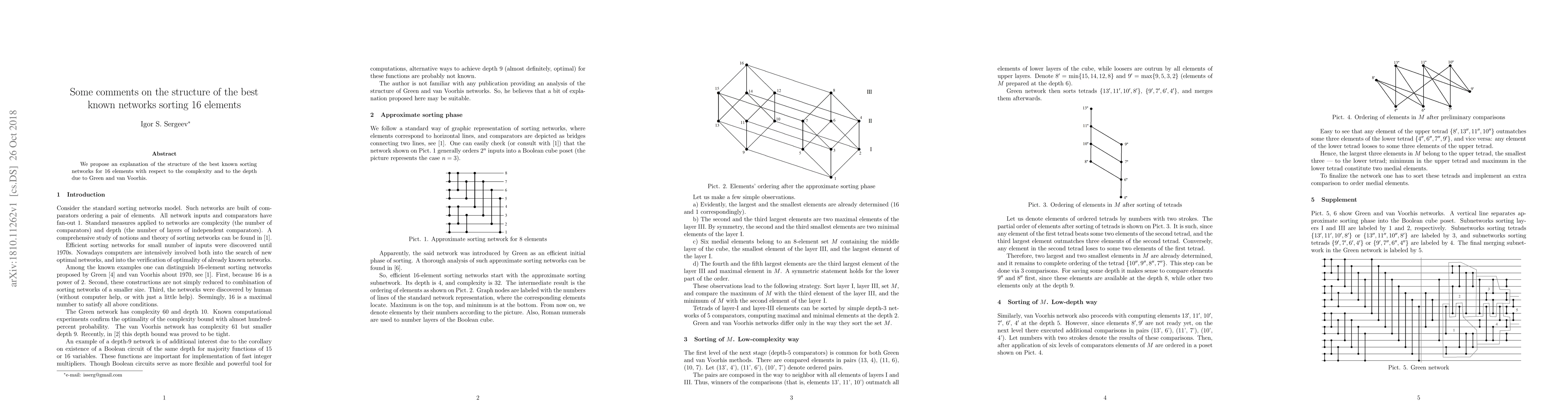 We propose an explanation of the structure of the best known sorting networks for 16 elements with respect to the complexity and to the depth due to Green and van Voorhis.