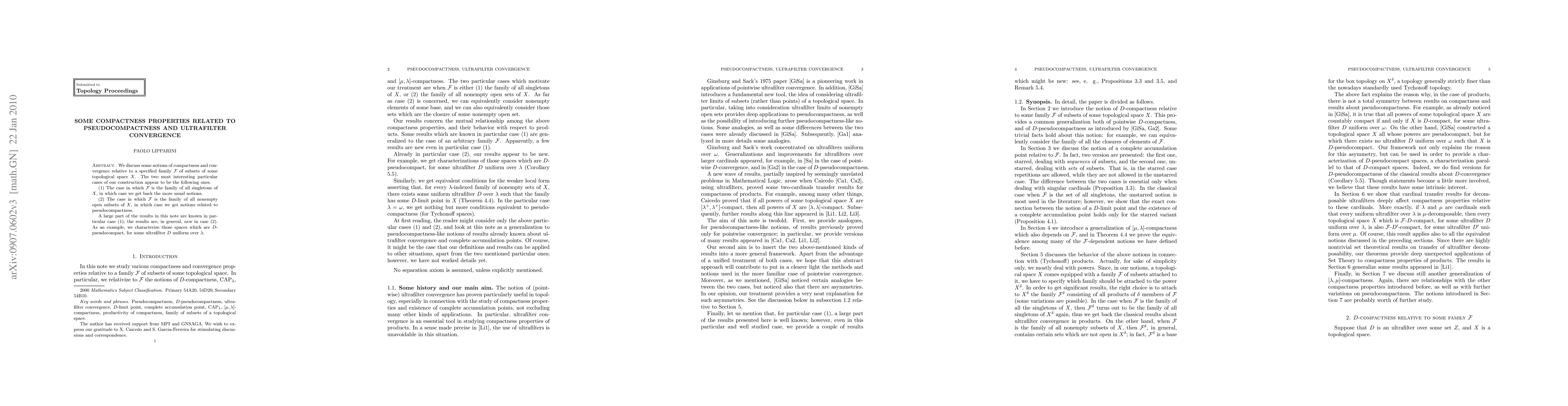 This paper explores novel notions of compactness and ultrafilter convergence defined relative to a family F of subsets in a topological space X. It specifically introduces new results when F consists of all nonempty open subsets, linking these to pseudocompactness, and characterizes D-pseudocompact spaces for ultrafilters uniform over λ.