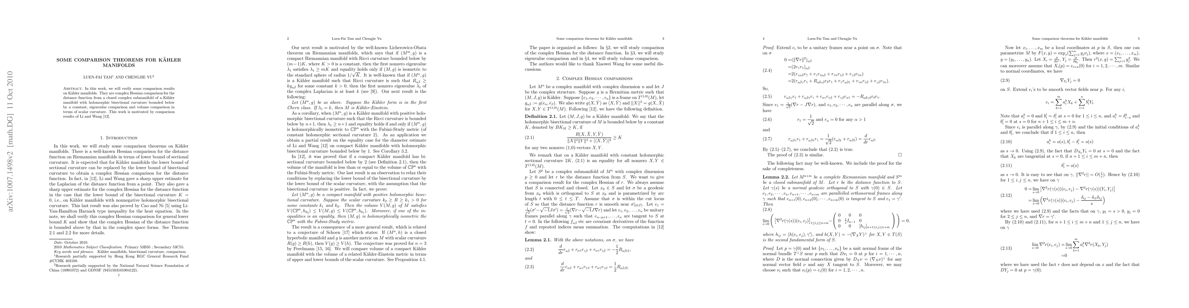This paper verifies several comparison theorems for Kähler manifolds, including complex Hessian comparison for the distance function, eigenvalue comparison, and volume comparison in terms of scalar curvature, motivated by prior work of Li and Wang.