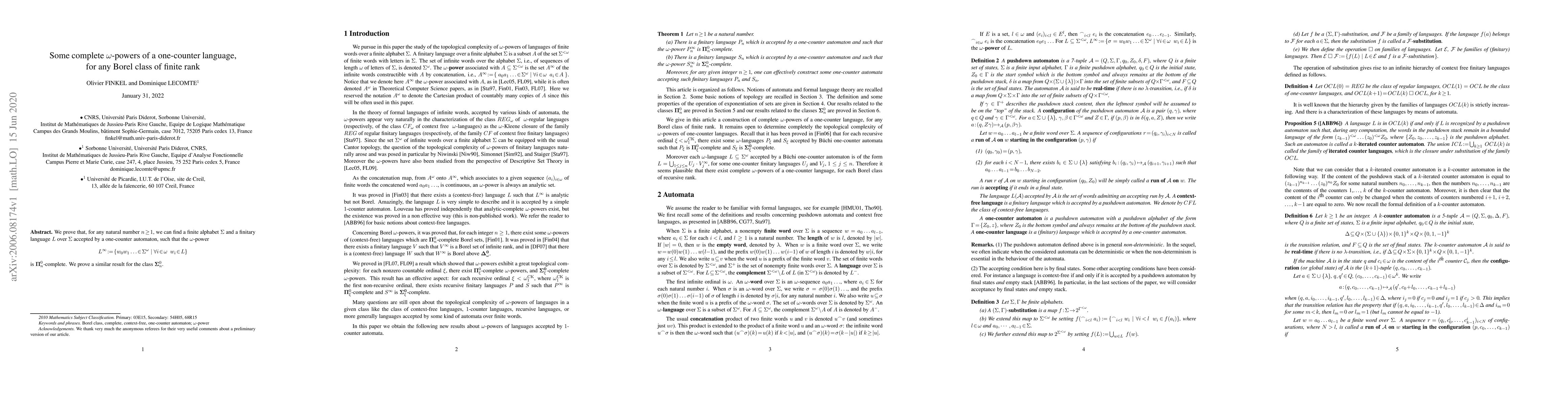 We prove that, for any natural number n $\ge$ 1, we can find a finite alphabet $\Sigma$ and a finitary language L over $\Sigma$ accepted by a one-counter automaton, such that the $\omega$-power L $\infty$ := {w 0 w 1. .. $\in$ $\Sigma$ $\omega$ | $\forall$i $\in$ $\omega$ w i $\in$ L} is $\Pi$ 0 n-complete. We prove a similar result for the class $\Sigma$ 0 n .