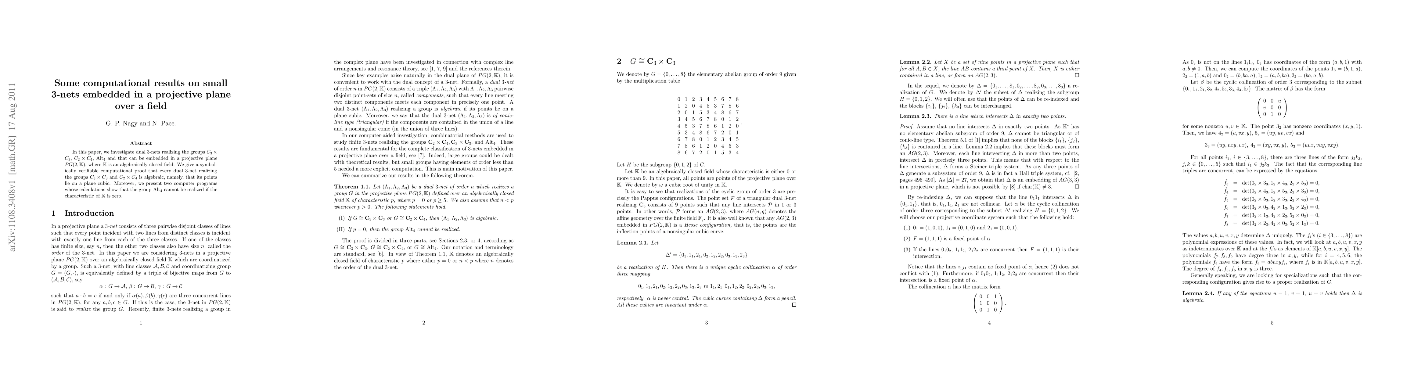 In this paper, we investigate dual 3-nets realizing the groups $C_3 \times C_3$, $C_2 \times C_4$, $\Alt_4$ and that can be embedded in a projective plane $PG(2,\mathbb K)$, where $\mathbb K$ is an algebraically closed field. We give a symbolically verifiable computational proof that every dual 3-net realizing the groups $C_3 \times C_3$ and $C_2 \times C_4$ is algebraic, namely, that its points lie on a plane cubic. Moreover, we present two computer programs whose calculations show that the group $\Alt_4$ cannot be realized if the characteristic of $\mathbb K$ is zero.