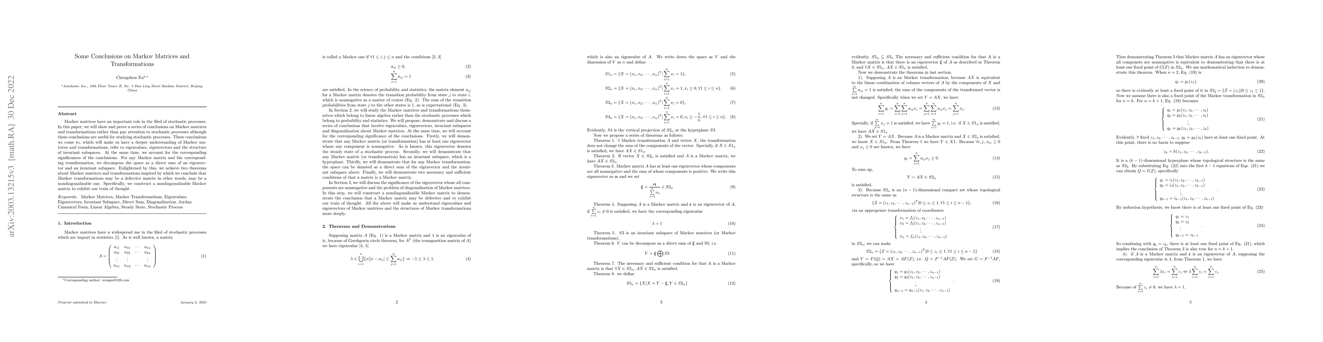 This paper explores conclusions about Markov matrices and transformations, focusing on eigenvalues, eigenvectors, and invariant subspaces. It demonstrates that Markov transformations can be nondiagonalizable and constructs a specific example to illustrate this concept.