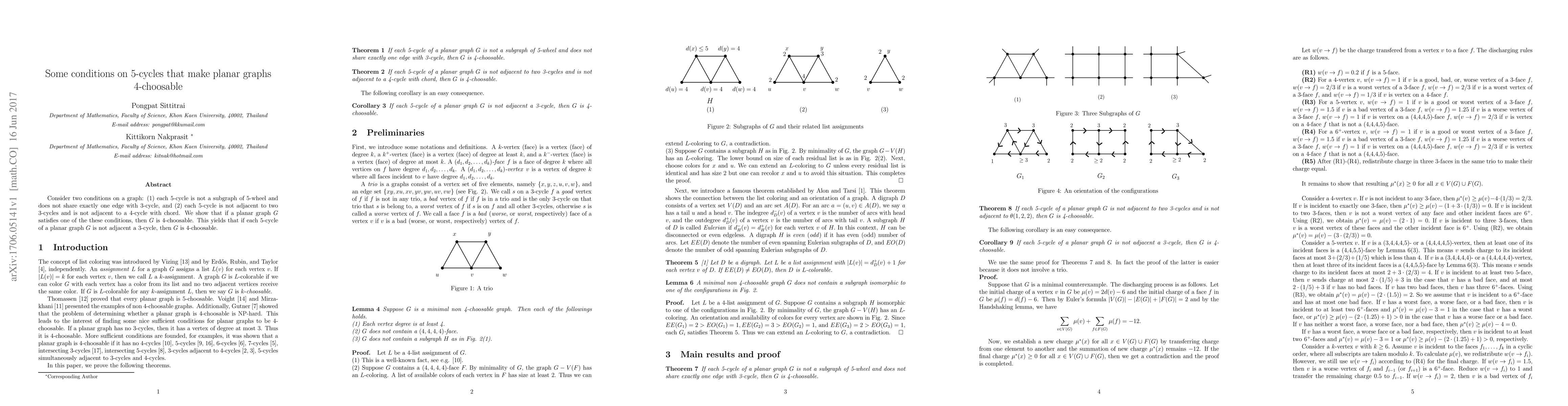 This paper demonstrates that if a planar graph $G$ meets specific conditions on its 5-cycles, such as not being part of a 5-wheel or adjacent to two 3-cycles, then $G$ is 4-choosable. Thus, if no 5-cycle shares an edge with a 3-cycle, $G$ is also 4-choosable.
