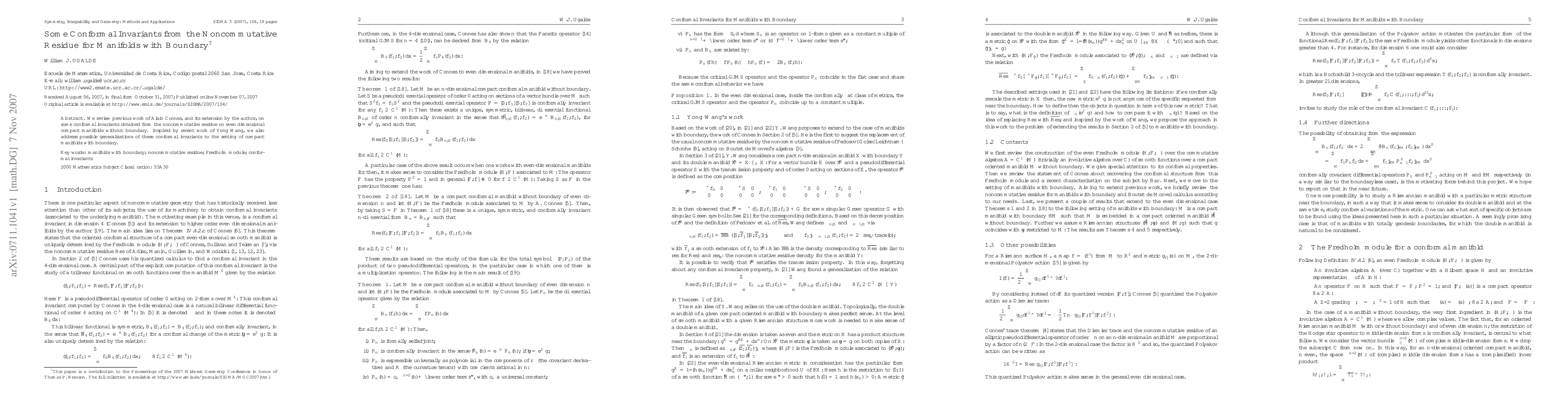 Summary: This paper reviews Alain Connes' work on conformal invariants derived from the noncommutative residue on even-dimensional manifolds without boundary and extends it to include compact manifolds with boundary, inspired by recent developments in the field.