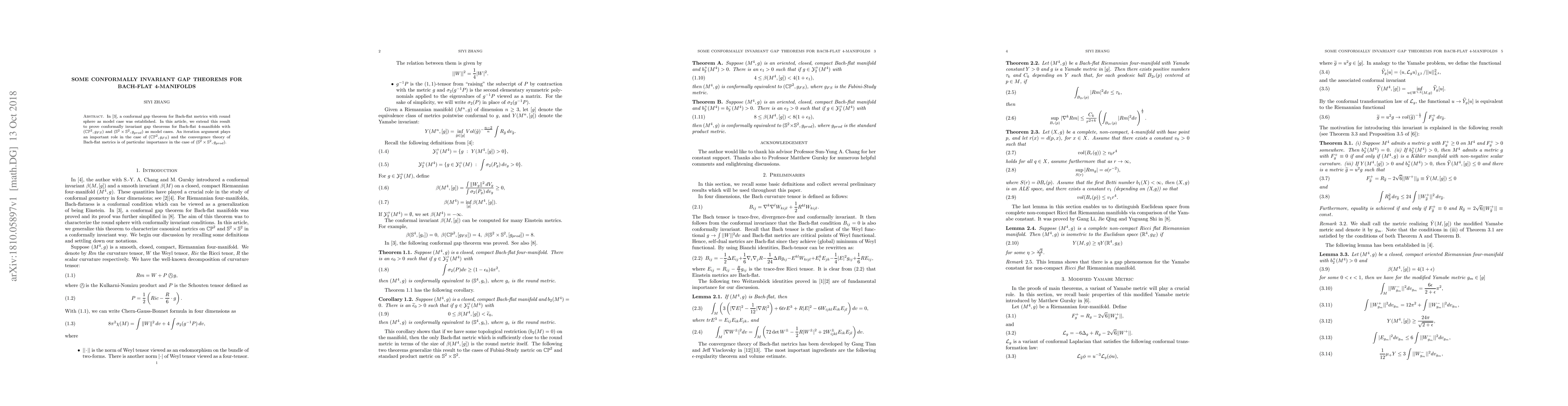 This paper extends conformally invariant gap theorems for Bach-flat metrics to Bach-flat 4-manifolds using $(\mathbb{CP}^2, g_{FS})$ and $(\mathbb{S}^2\times\mathbb{S}^2,g_{prod})$ as model cases, with iteration arguments and convergence theory playing crucial roles.