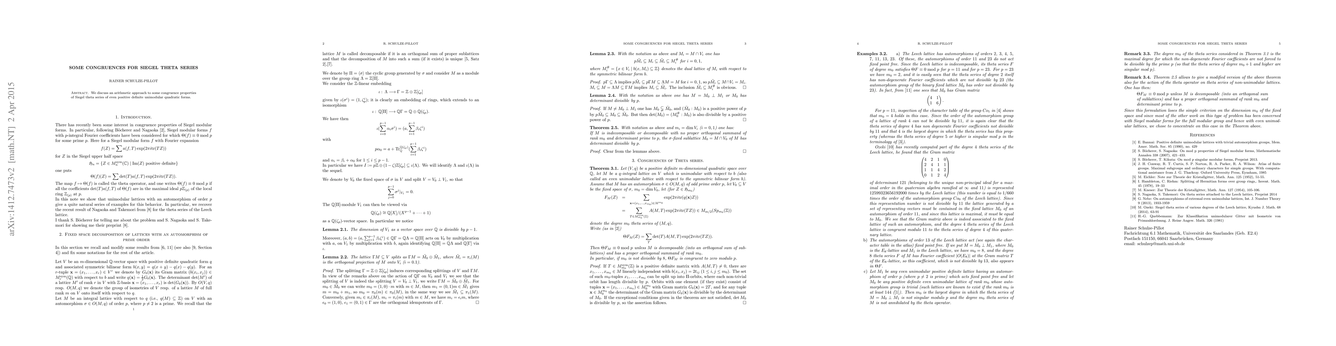 Summary: This paper explores arithmetic congruence properties of Siegel theta series associated with even positive definite unimodular quadratic forms, employing an arithmetic approach. The findings contribute to understanding the modular behavior of these complex mathematical objects.