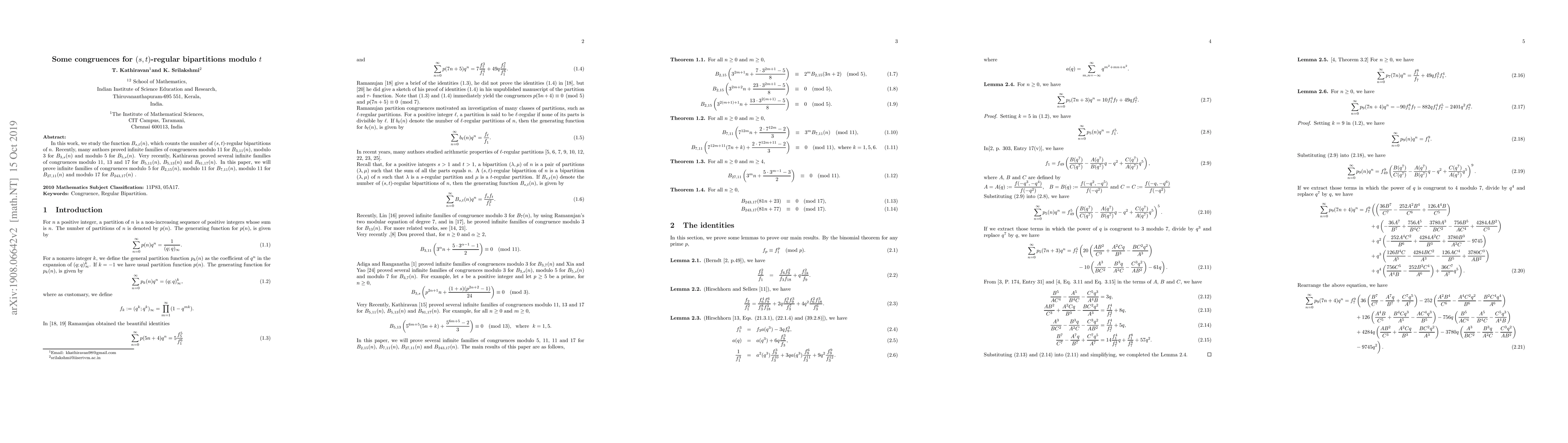 This paper investigates the function $B_{s,t}(n)$ counting $(s,t)$-regular bipartitions and proves new infinite families of congruences for various combinations of $s$ and $t$, including modulo $5$, $11$, and $17$ congruences for specific cases.