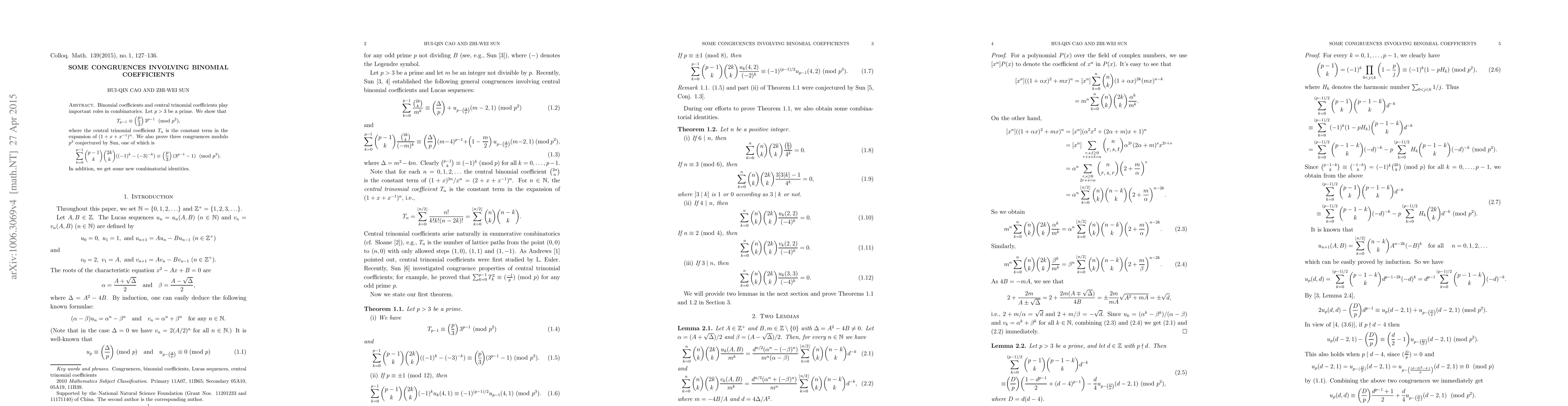Binomial coefficients and central trinomial coefficients play important roles in combinatorics. Let $p>3$ be a prime. We show that $$T_{p-1}\equiv\left(\frac p3\right)3^{p-1}\ \pmod{p^2},$$ where the central trinomial coefficient $T_n$ is the constant term in the expansion of $(1+x+x^{-1})^n$. We also prove three congruences modulo $p^3$ conjectured by Sun, one of which is $$\sum_{k=0}^{p-1}\binom{p-1}k\binom{2k}k((-1)^k-(-3)^{-k})\equiv \left(\frac p3\right)(3^{p-1}-1)\ \pmod{p^3}.$$ In addition, we get some new combinatorial identities.
