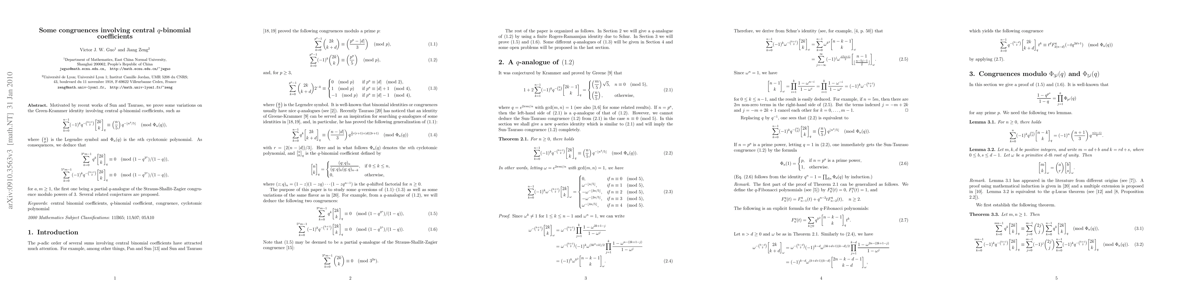 This paper proves new congruences involving central q-binomial coefficients, extending the Green-Krammer identity, and includes results modulo cyclotomic polynomials and Legendre symbols. It also proposes related conjectures and partial q-analogues of existing congruences.