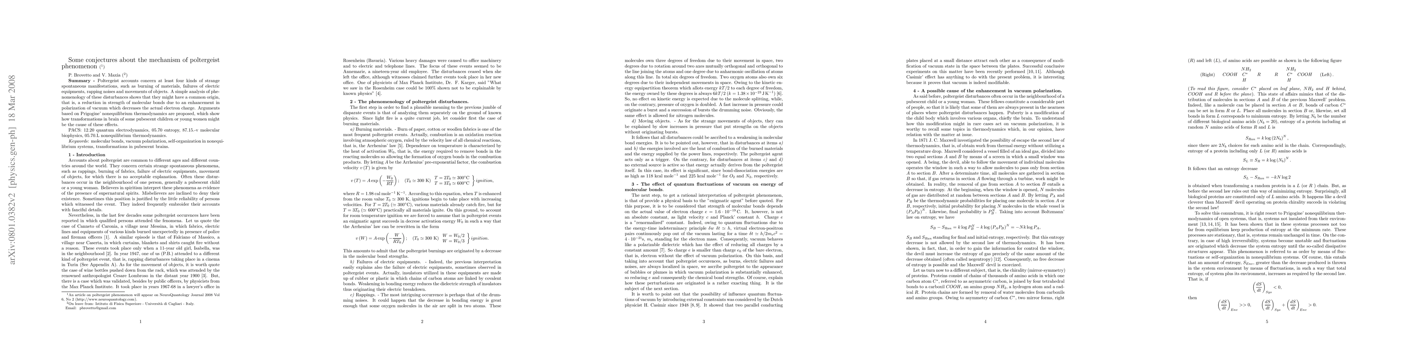 Poltergeist accounts concern at least four kinds of strange spontaneous manifestations, such as burning of materials, failures of electric equipments, rapping noises and movements of objects. A simple analysis of phenomenology of these disturbances shows that they might have a common origin, that is, a reduction in strength of molecular bonds due to an enhancement in polarization of vacuum which decreases the actual electron charge. Arguments based on Prigogine' nonequilibrium thermodynamics are proposed, which show how transformations in brain of some pubescent childs or young womans might be the cause of these effects.